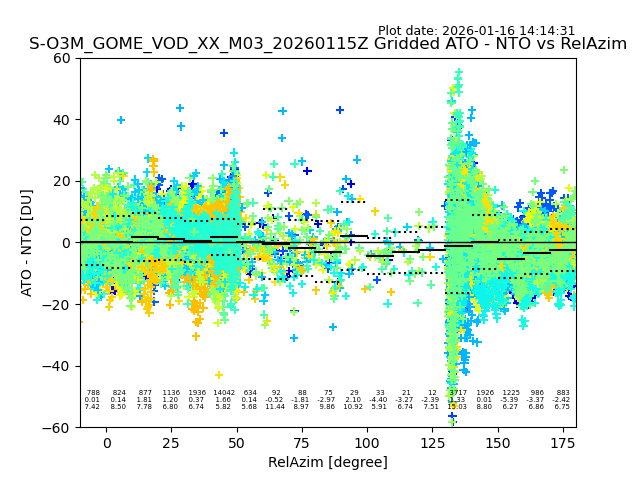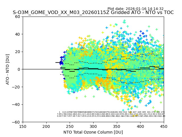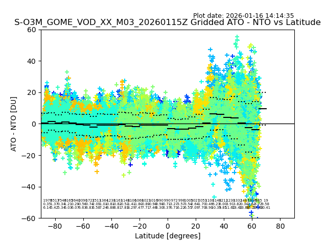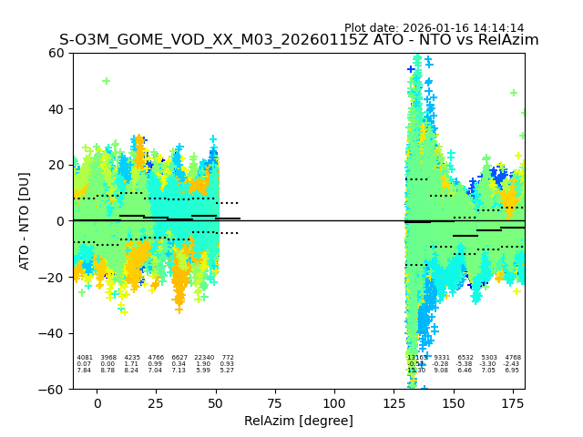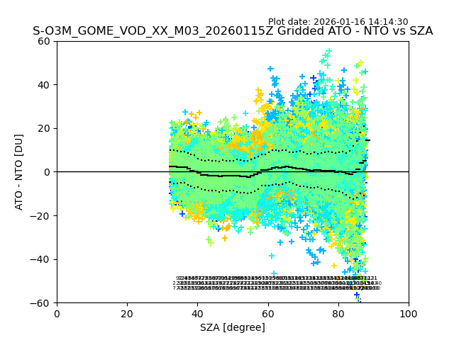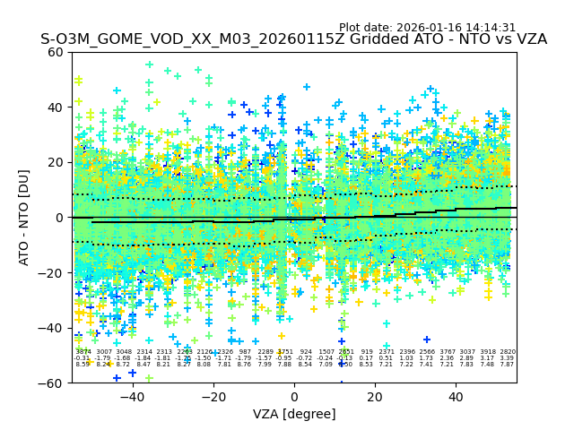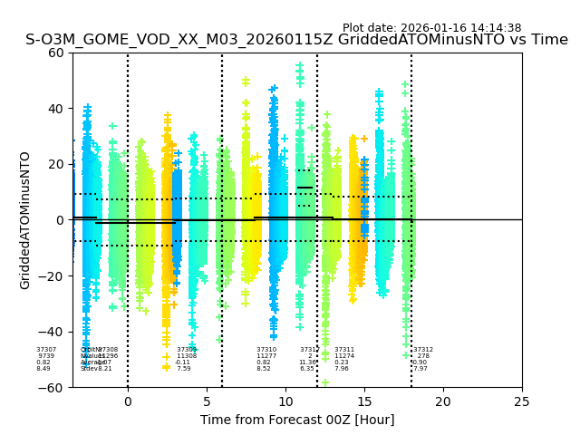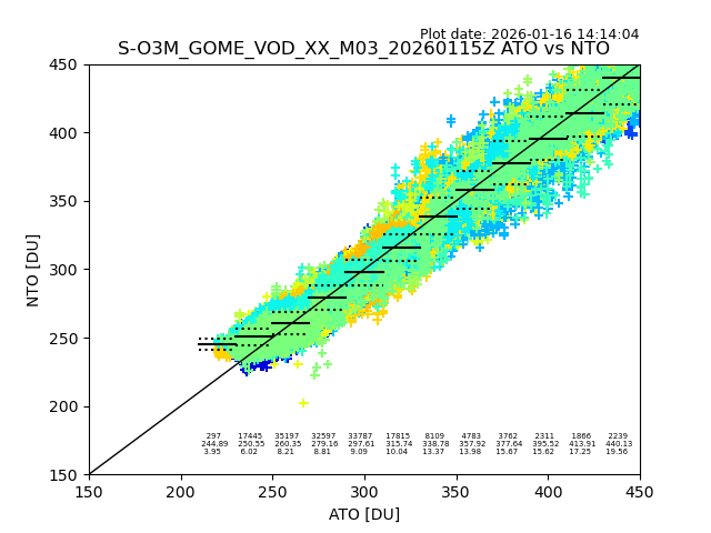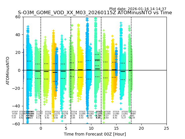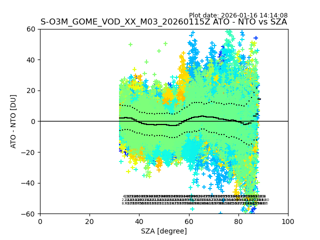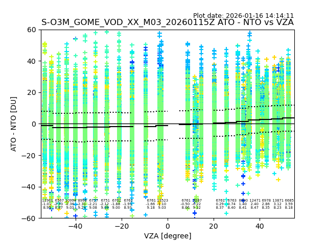 The date given in the title of the plot indicates the T=0 day for which the NTO/O3 data is compared. Example: S-O3M_GOME_VOD__M02_20110117Z indicates that the plot is for data from 2011-01-17 00:00 up NTO/O3 files starting at 2011-01-17 23:59 is used.