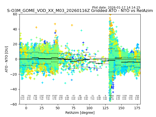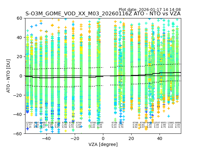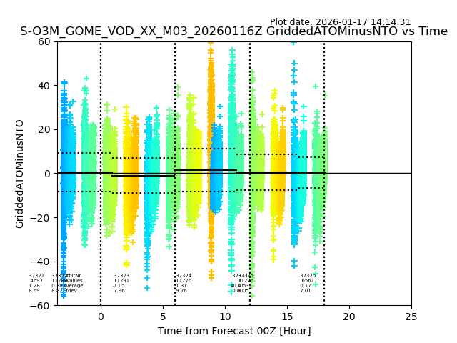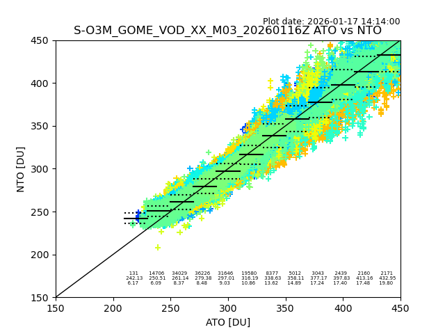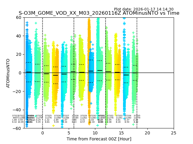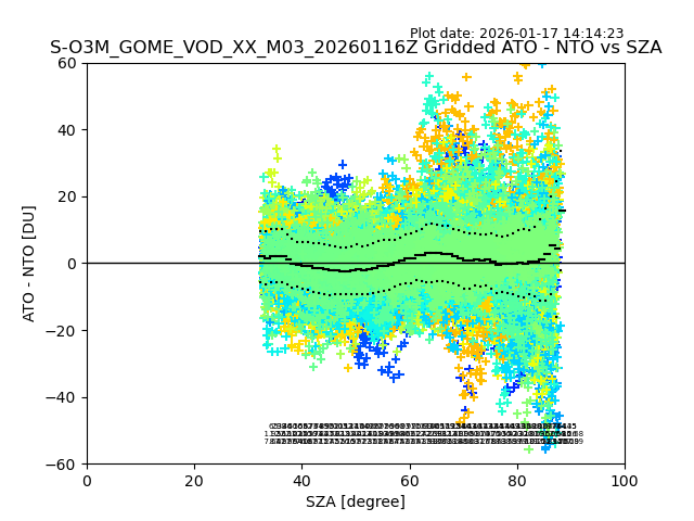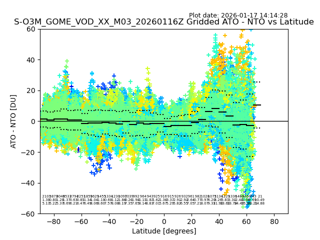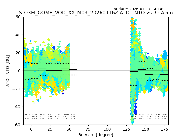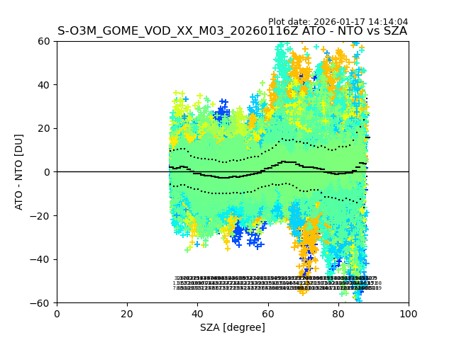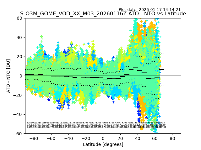 The date given in the title of the plot indicates the T=0 day for which the NTO/O3 data is compared. Example: S-O3M_GOME_VOD__M02_20110117Z indicates that the plot is for data from 2011-01-17 00:00 up NTO/O3 files starting at 2011-01-17 23:59 is used.