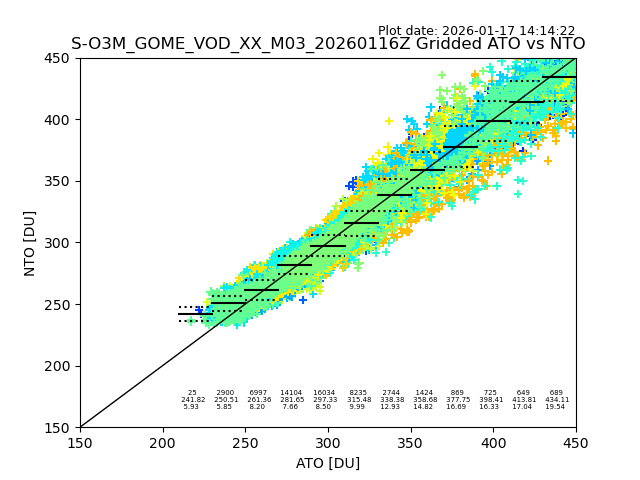 Using these forecast fields, the actual measured NTO/O3 from T=0 to T+24h can be compared. The comparison can be between each individual NTO/O3 retrieval and the ATO value in the associated grid box, or between 'pre-gridded' NTO/O3 values and the ATO value. Both these comparisons are given.