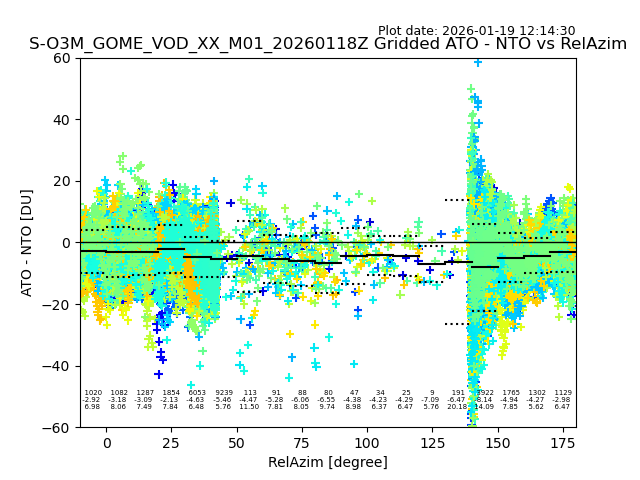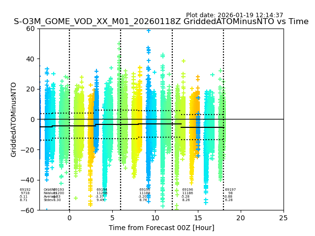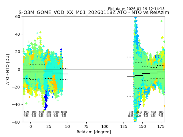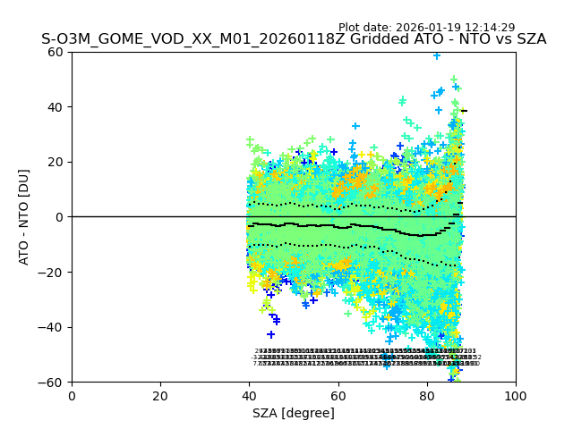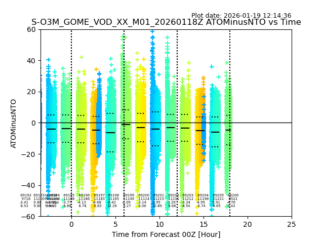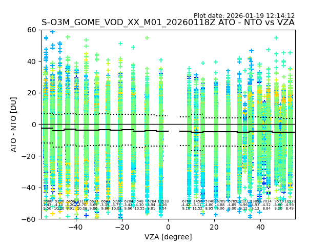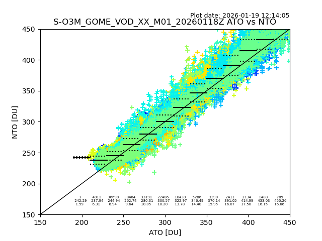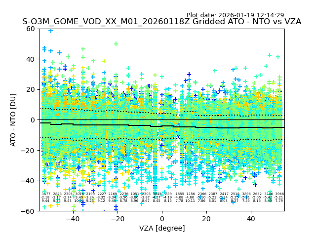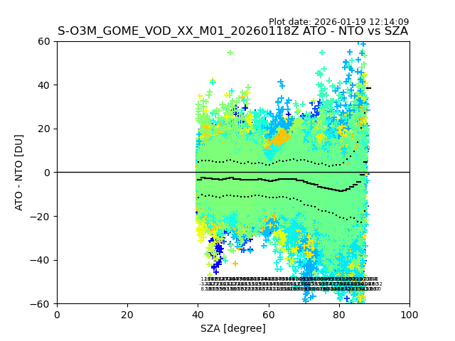 The date given in the title of the plot indicates the T=0 day for which the NTO/O3 data is compared. Example: S-O3M_GOME_VOD__M02_20110117Z indicates that the plot is for data from 2011-01-17 00:00 up NTO/O3 files starting at 2011-01-17 23:59 is used.