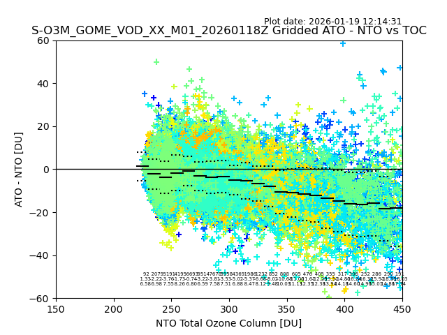 Using these forecast fields, the actual measured NTO/O3 from T=0 to T+24h can be compared. The comparison can be between each individual NTO/O3 retrieval and the ATO value in the associated grid box, or between 'pre-gridded' NTO/O3 values and the ATO value. Both these comparisons are given.