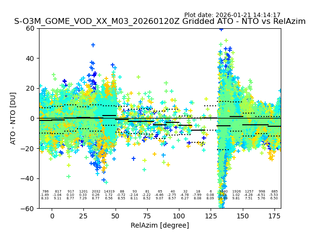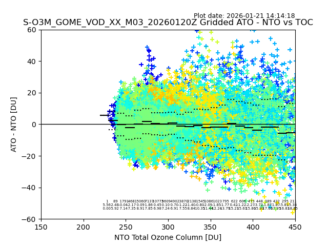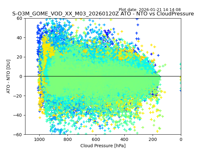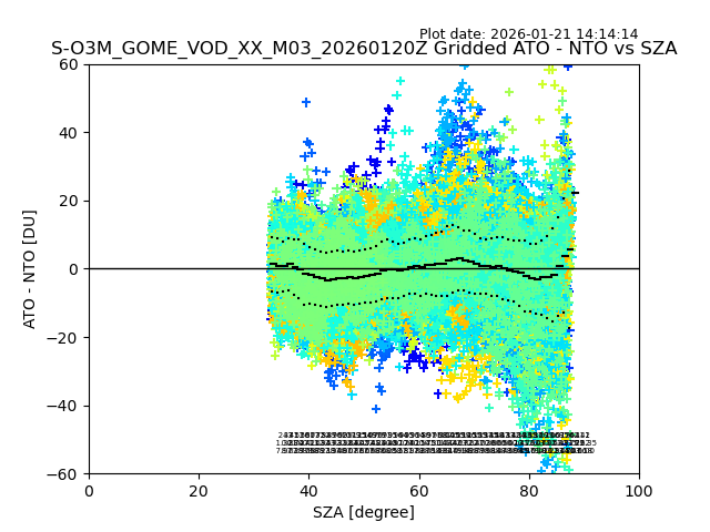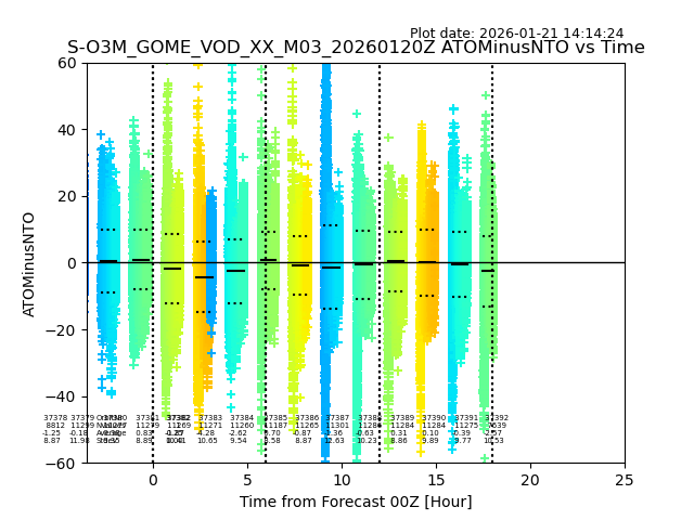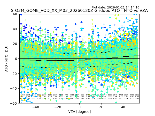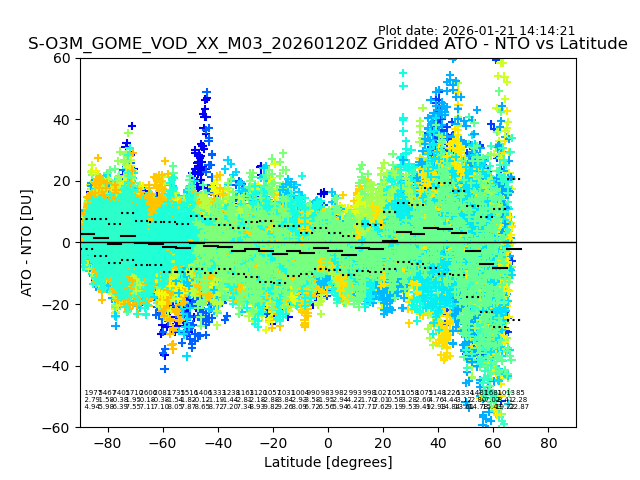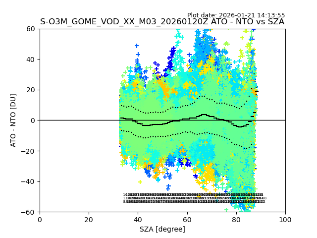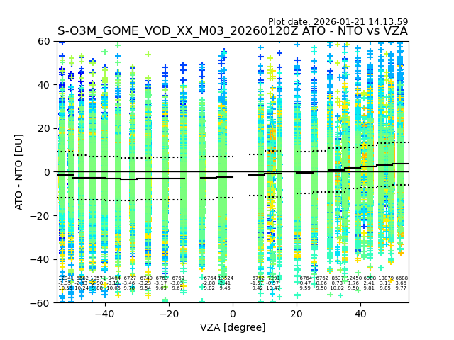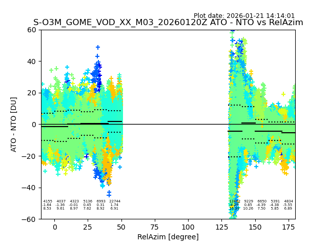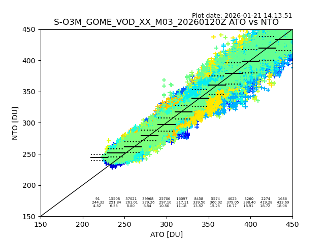 The date given in the title of the plot indicates the T=0 day for which the NTO/O3 data is compared. Example: S-O3M_GOME_VOD__M02_20110117Z indicates that the plot is for data from 2011-01-17 00:00 up NTO/O3 files starting at 2011-01-17 23:59 is used.