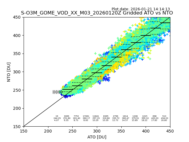 Using these forecast fields, the actual measured NTO/O3 from T=0 to T+24h can be compared. The comparison can be between each individual NTO/O3 retrieval and the ATO value in the associated grid box, or between 'pre-gridded' NTO/O3 values and the ATO value. Both these comparisons are given.
