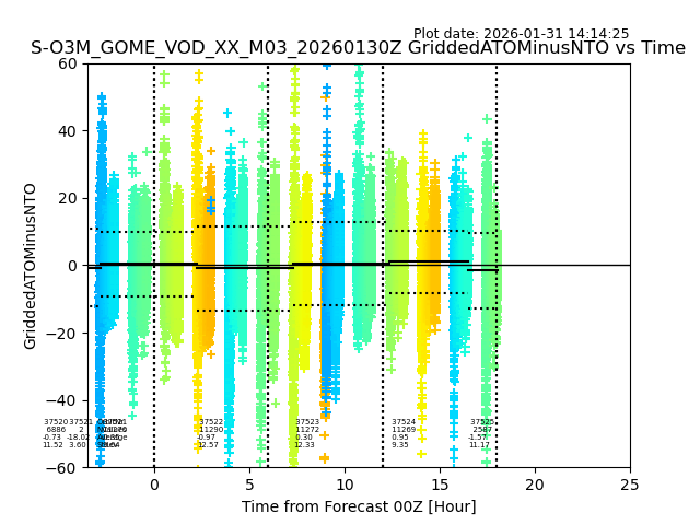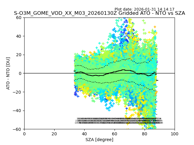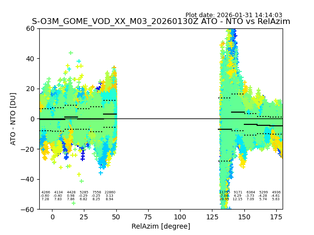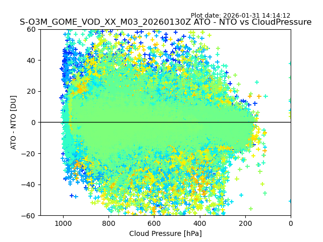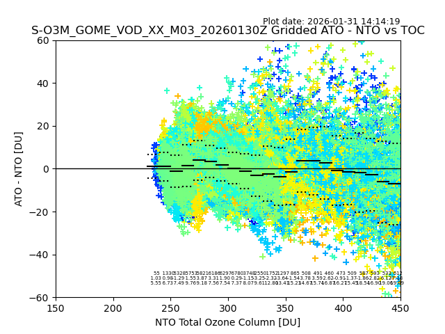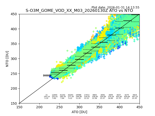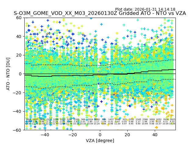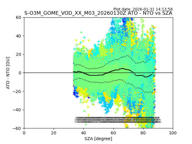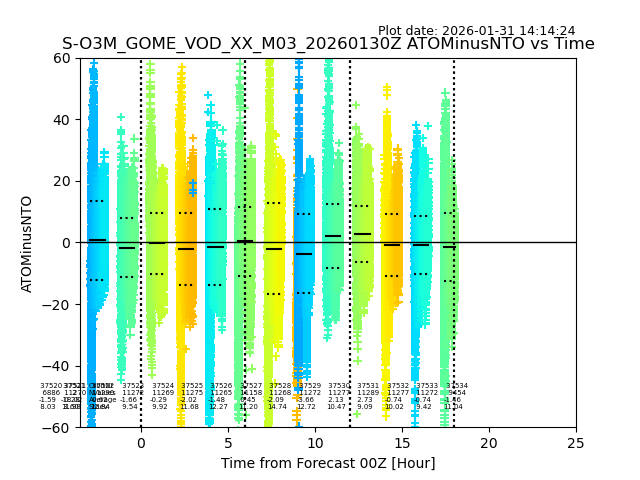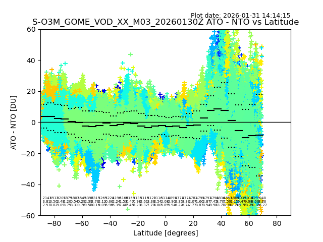 The date given in the title of the plot indicates the T=0 day for which the NTO/O3 data is compared. Example: S-O3M_GOME_VOD__M02_20110117Z indicates that the plot is for data from 2011-01-17 00:00 up NTO/O3 files starting at 2011-01-17 23:59 is used.