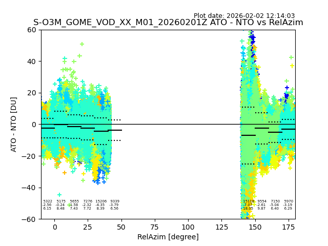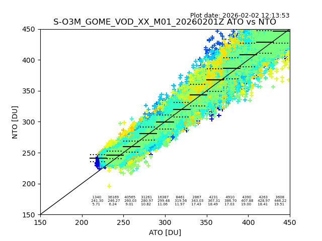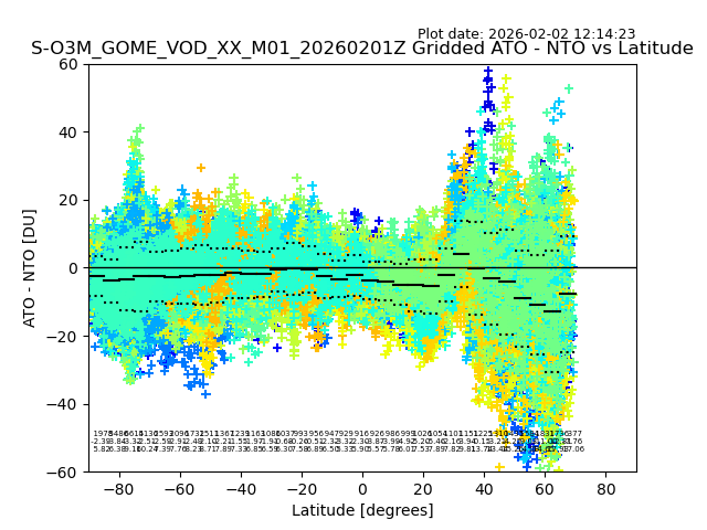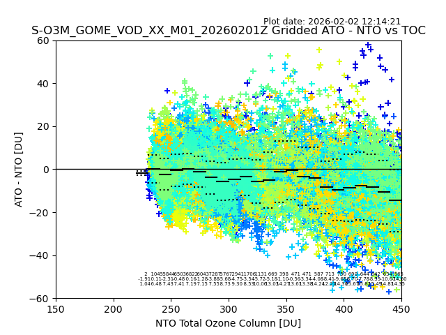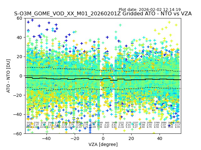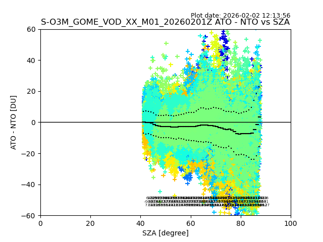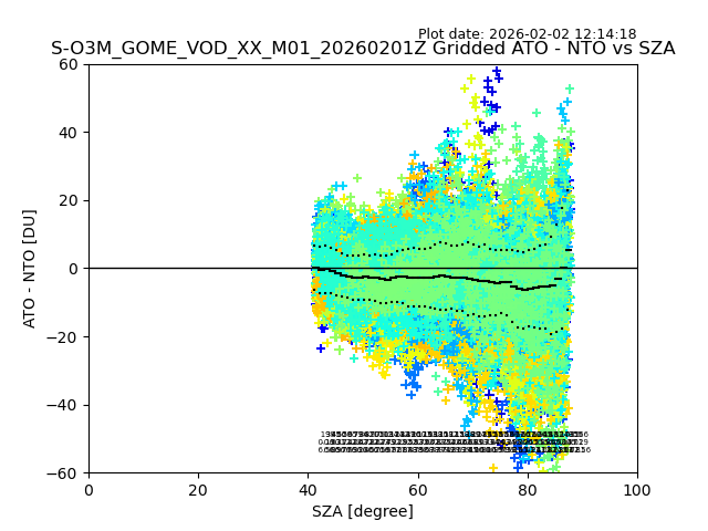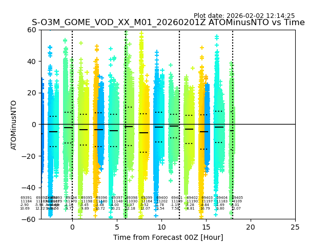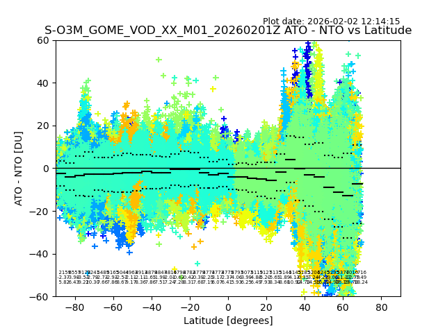 The date given in the title of the plot indicates the T=0 day for which the NTO/O3 data is compared. Example: S-O3M_GOME_VOD__M02_20110117Z indicates that the plot is for data from 2011-01-17 00:00 up NTO/O3 files starting at 2011-01-17 23:59 is used.