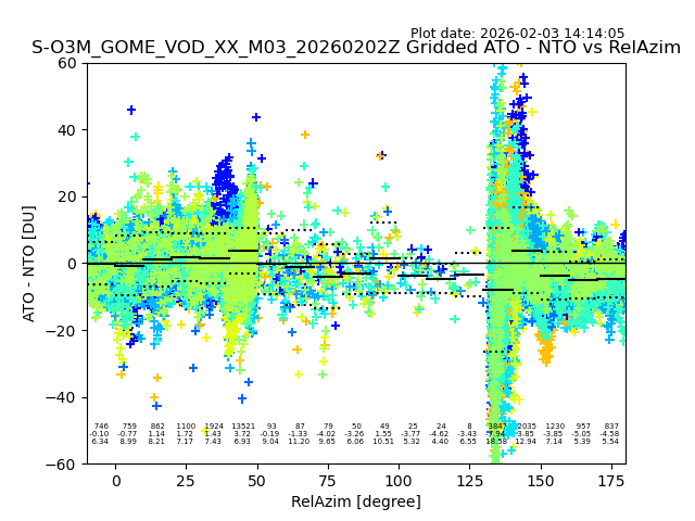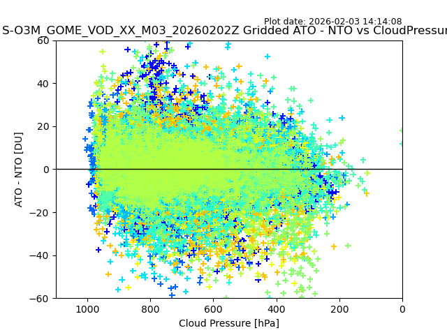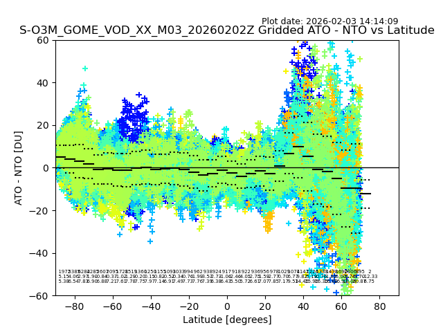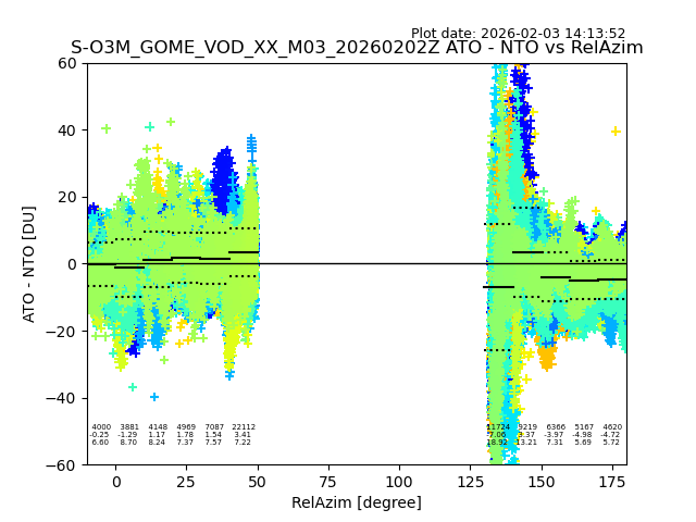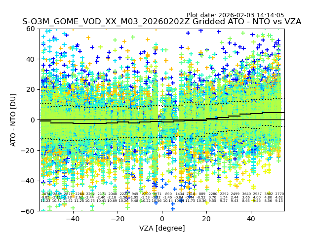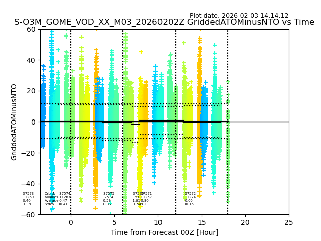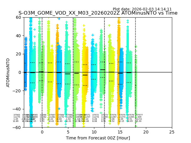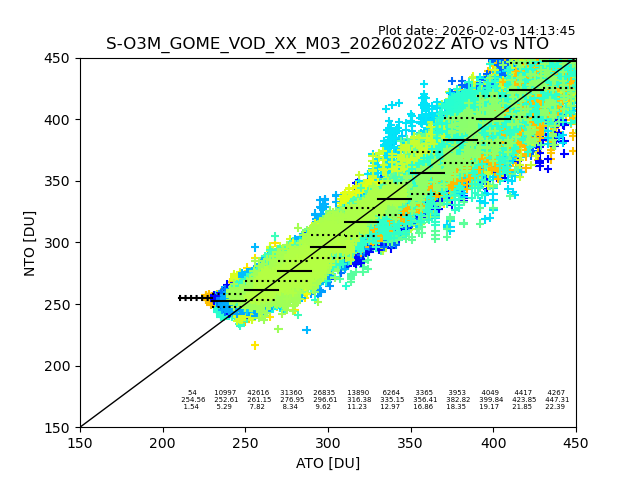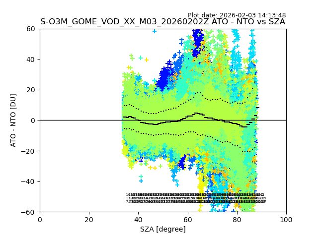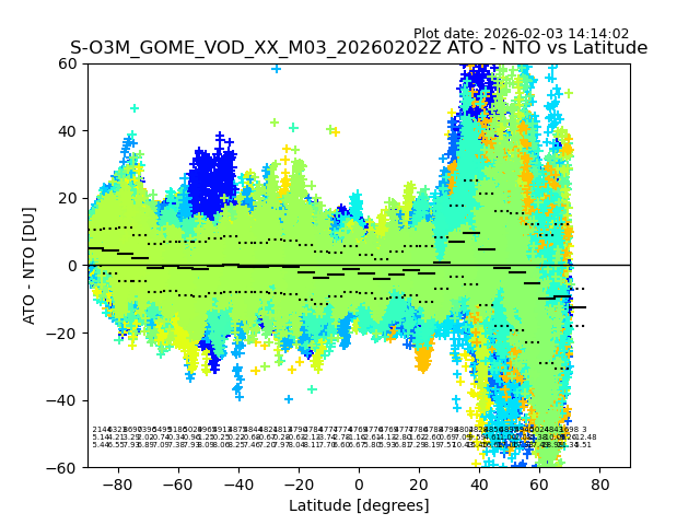 The date given in the title of the plot indicates the T=0 day for which the NTO/O3 data is compared. Example: S-O3M_GOME_VOD__M02_20110117Z indicates that the plot is for data from 2011-01-17 00:00 up NTO/O3 files starting at 2011-01-17 23:59 is used.
