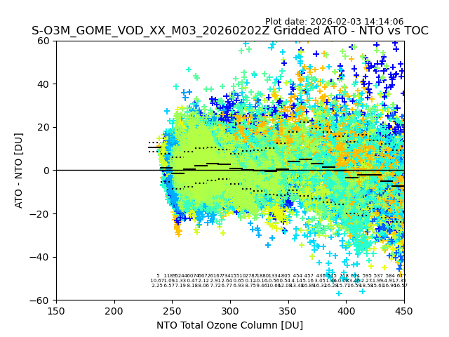 Using these forecast fields, the actual measured NTO/O3 from T=0 to T+24h can be compared. The comparison can be between each individual NTO/O3 retrieval and the ATO value in the associated grid box, or between 'pre-gridded' NTO/O3 values and the ATO value. Both these comparisons are given.