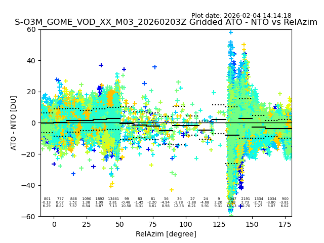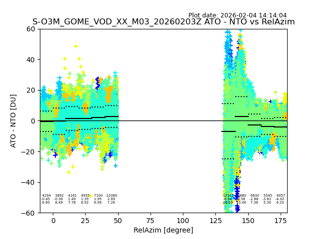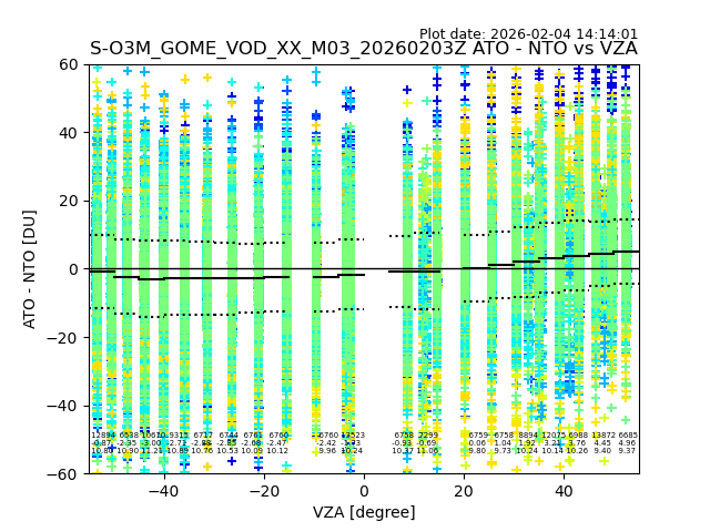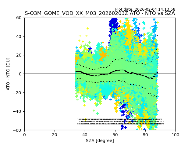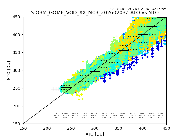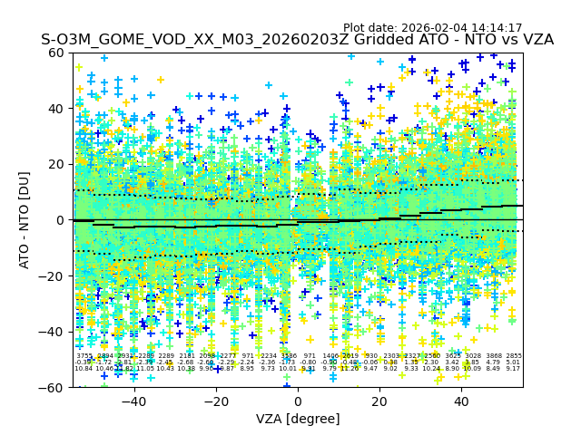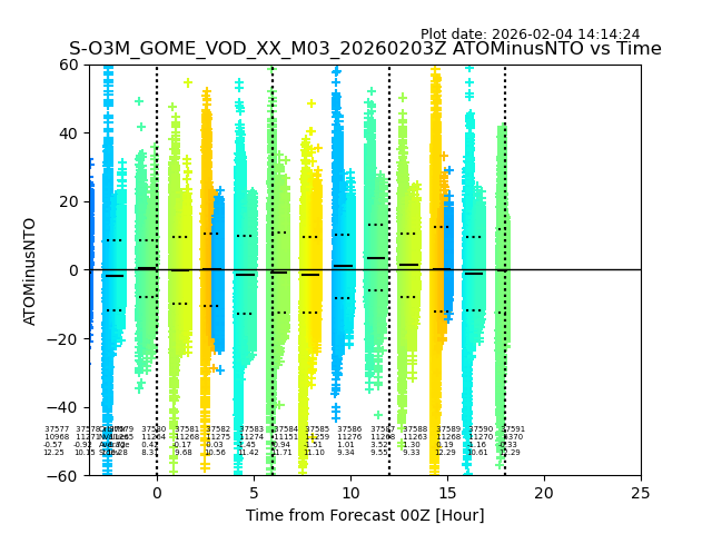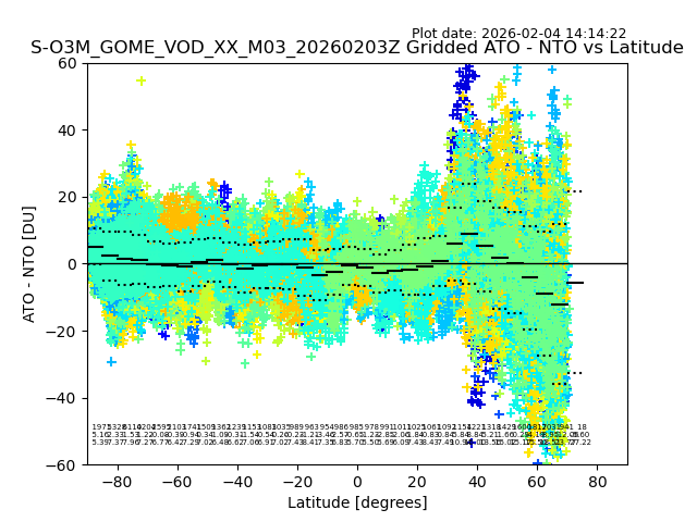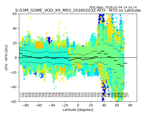 The date given in the title of the plot indicates the T=0 day for which the NTO/O3 data is compared. Example: S-O3M_GOME_VOD__M02_20110117Z indicates that the plot is for data from 2011-01-17 00:00 up NTO/O3 files starting at 2011-01-17 23:59 is used.