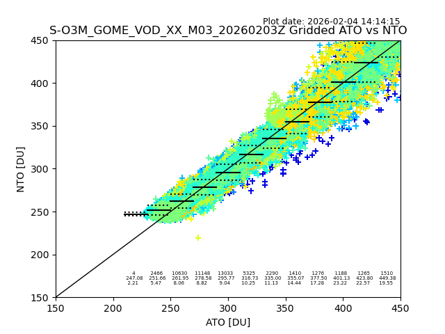 Using these forecast fields, the actual measured NTO/O3 from T=0 to T+24h can be compared. The comparison can be between each individual NTO/O3 retrieval and the ATO value in the associated grid box, or between 'pre-gridded' NTO/O3 values and the ATO value. Both these comparisons are given.