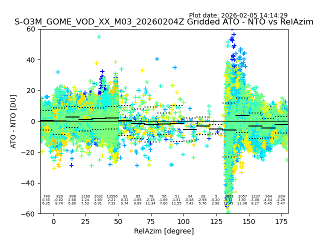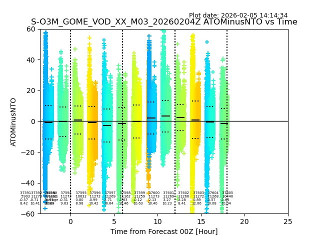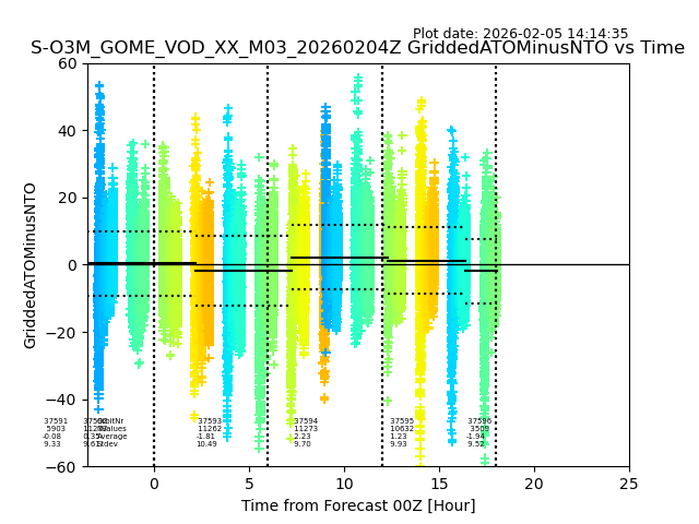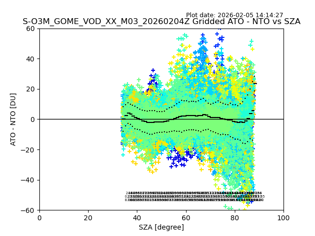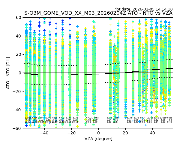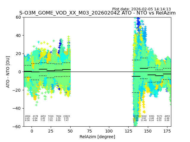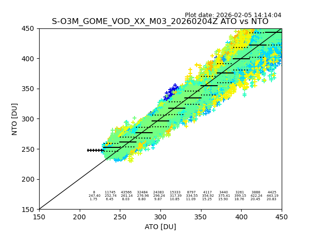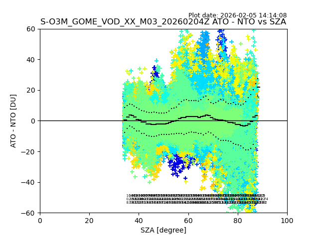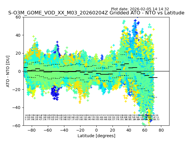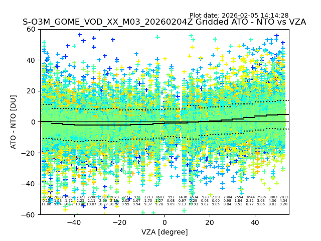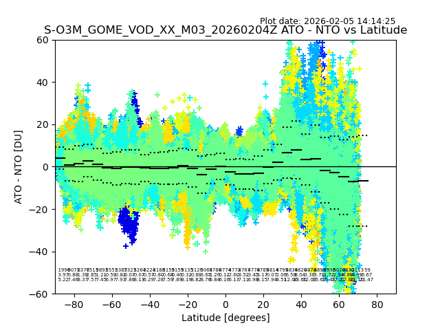 The date given in the title of the plot indicates the T=0 day for which the NTO/O3 data is compared. Example: S-O3M_GOME_VOD__M02_20110117Z indicates that the plot is for data from 2011-01-17 00:00 up NTO/O3 files starting at 2011-01-17 23:59 is used.