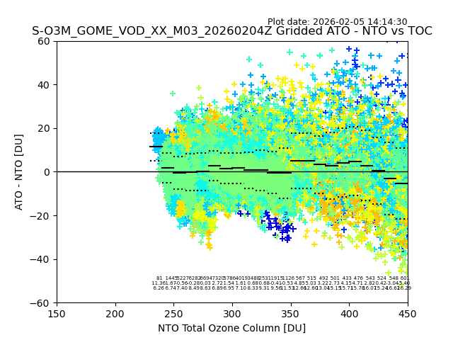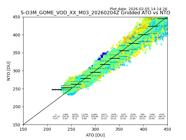Using these forecast fields, the actual measured NTO/O3 from T=0 to T+24h can be compared. The comparison can be between each individual NTO/O3 retrieval and the ATO value in the associated grid box, or between 'pre-gridded' NTO/O3 values and the ATO value. Both these comparisons are given.