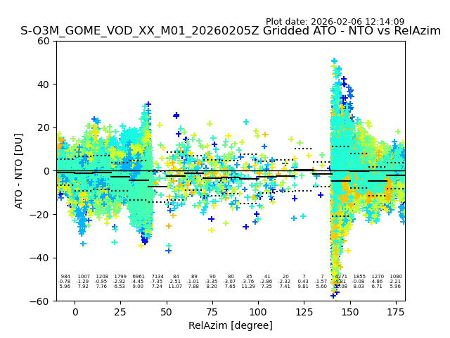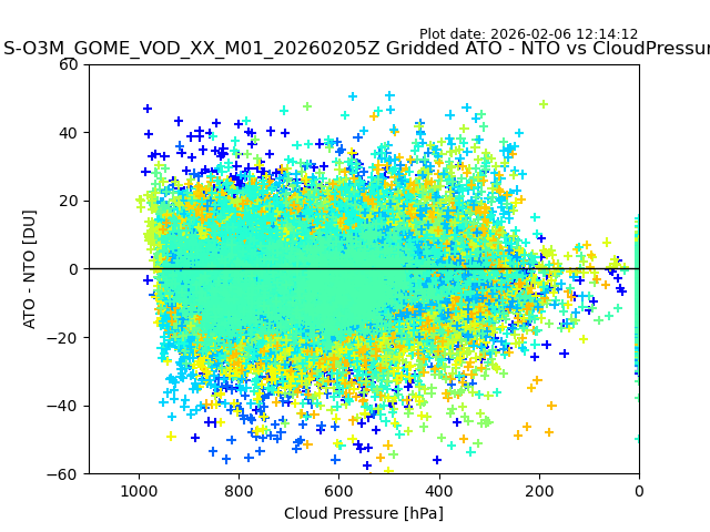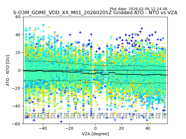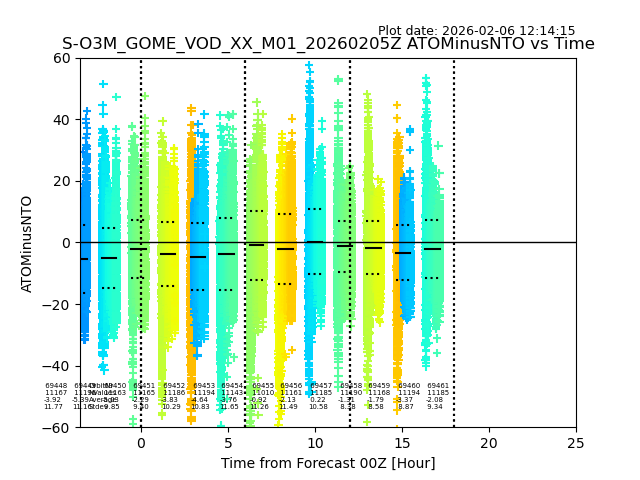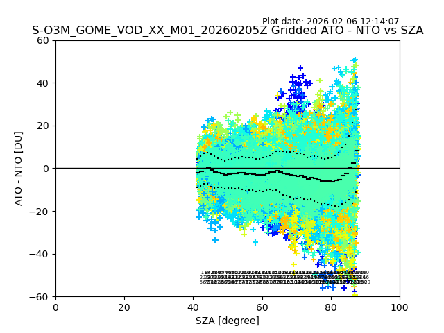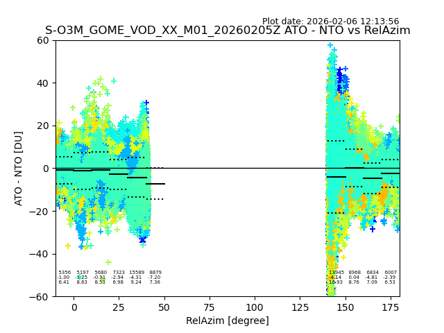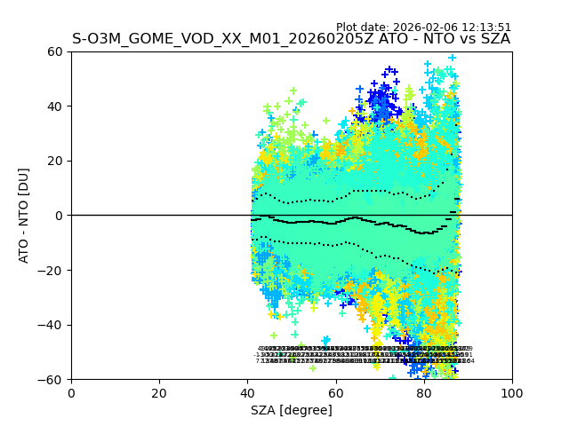 The date given in the title of the plot indicates the T=0 day for which the NTO/O3 data is compared. Example: S-O3M_GOME_VOD__M02_20110117Z indicates that the plot is for data from 2011-01-17 00:00 up NTO/O3 files starting at 2011-01-17 23:59 is used.