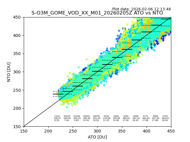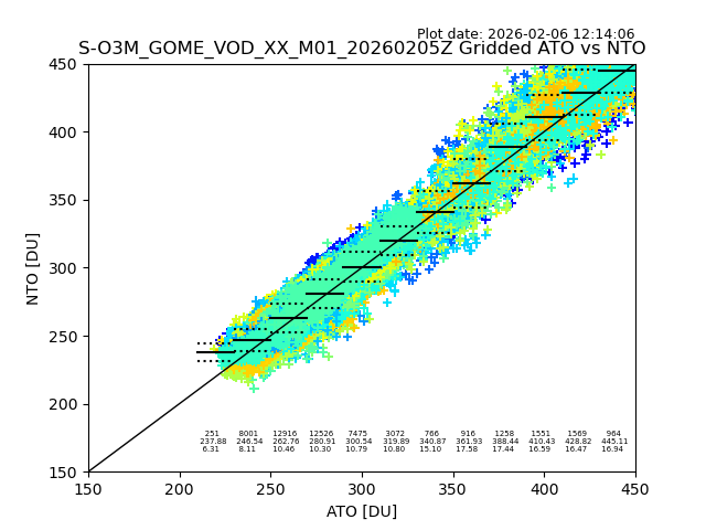 Using these forecast fields, the actual measured NTO/O3 from T=0 to T+24h can be compared. The comparison can be between each individual NTO/O3 retrieval and the ATO value in the associated grid box, or between 'pre-gridded' NTO/O3 values and the ATO value. Both these comparisons are given.
