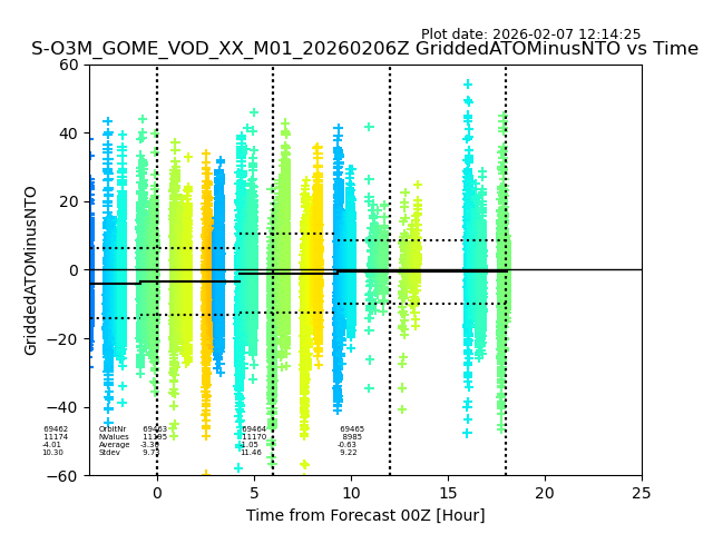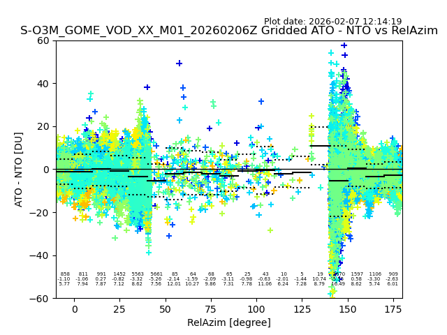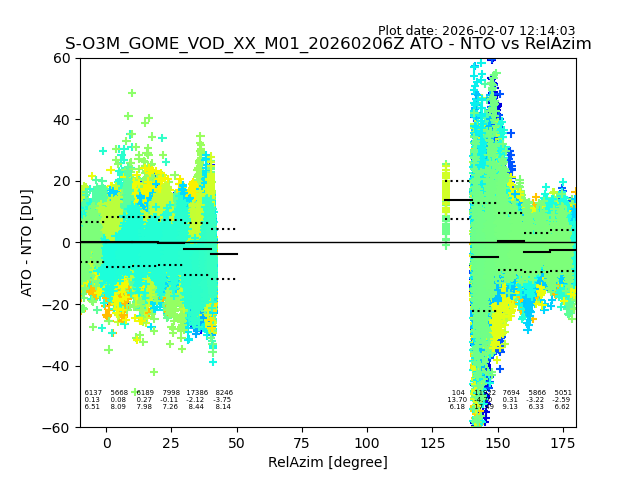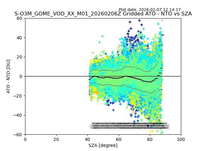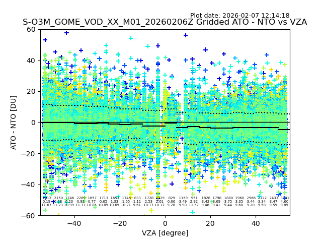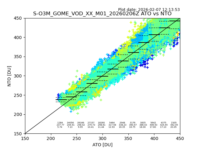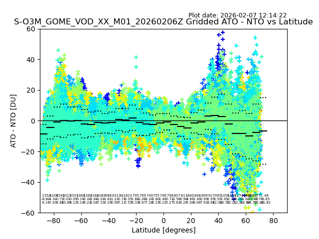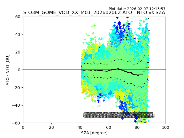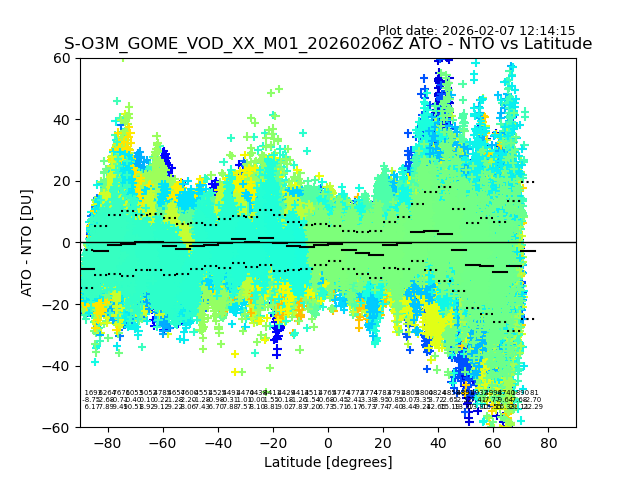 The date given in the title of the plot indicates the T=0 day for which the NTO/O3 data is compared. Example: S-O3M_GOME_VOD__M02_20110117Z indicates that the plot is for data from 2011-01-17 00:00 up NTO/O3 files starting at 2011-01-17 23:59 is used.