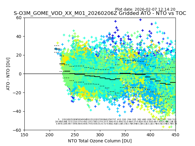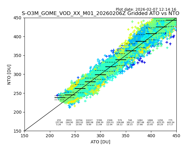Using these forecast fields, the actual measured NTO/O3 from T=0 to T+24h can be compared. The comparison can be between each individual NTO/O3 retrieval and the ATO value in the associated grid box, or between 'pre-gridded' NTO/O3 values and the ATO value. Both these comparisons are given.