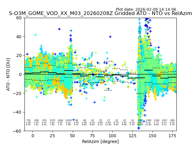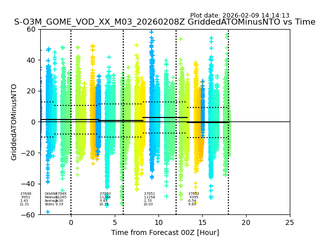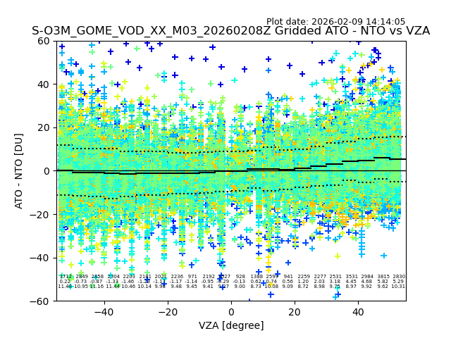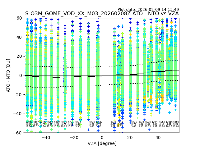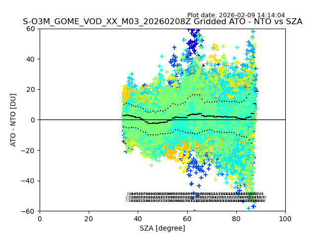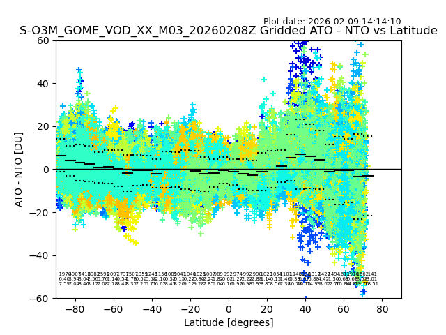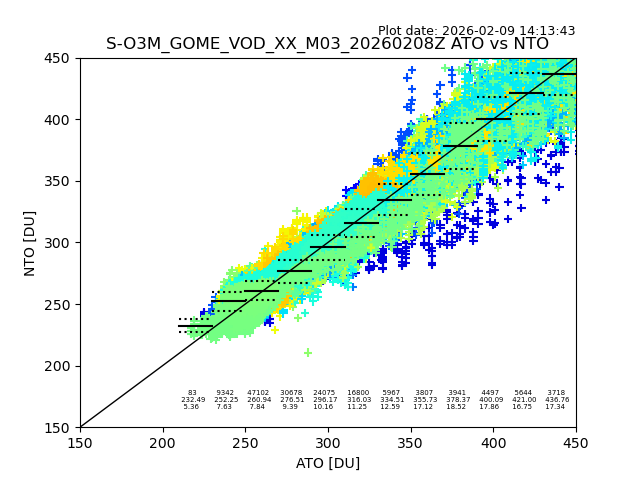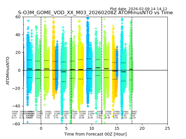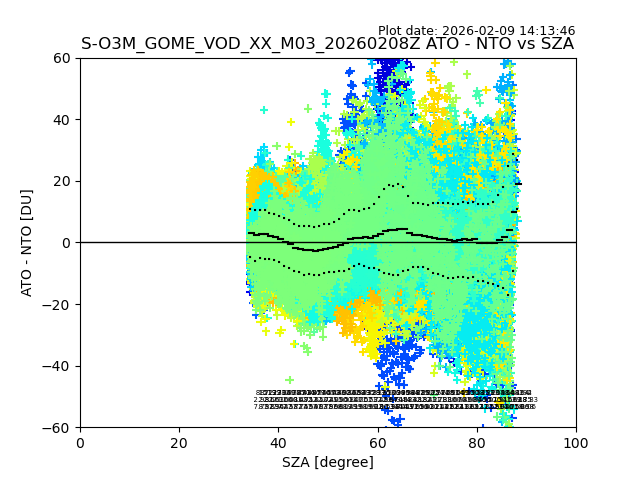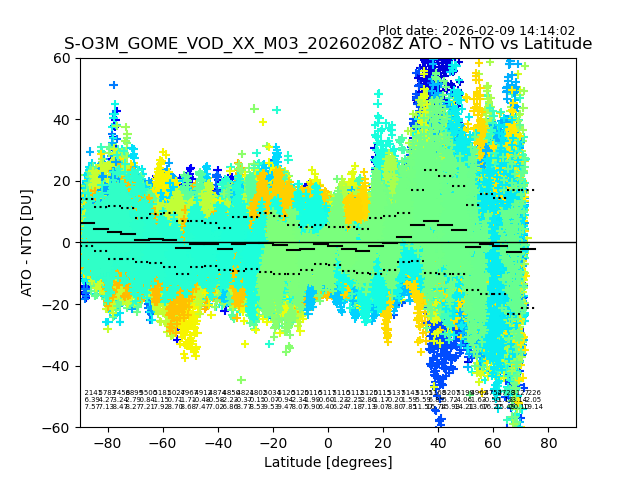 The date given in the title of the plot indicates the T=0 day for which the NTO/O3 data is compared. Example: S-O3M_GOME_VOD__M02_20110117Z indicates that the plot is for data from 2011-01-17 00:00 up NTO/O3 files starting at 2011-01-17 23:59 is used.