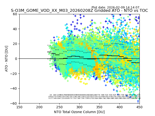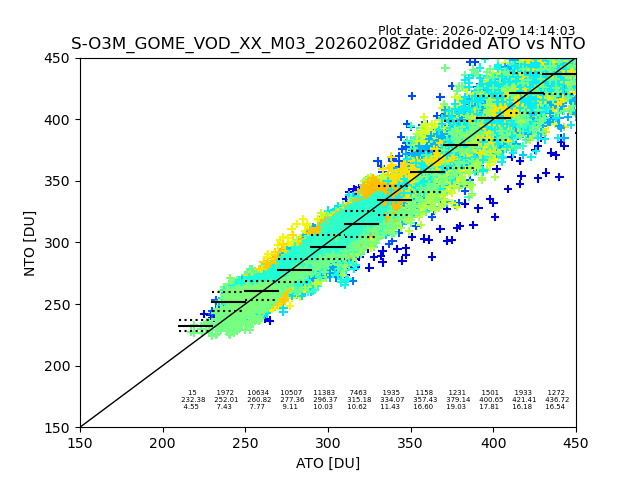 Using these forecast fields, the actual measured NTO/O3 from T=0 to T+24h can be compared. The comparison can be between each individual NTO/O3 retrieval and the ATO value in the associated grid box, or between 'pre-gridded' NTO/O3 values and the ATO value. Both these comparisons are given.
