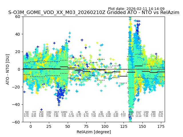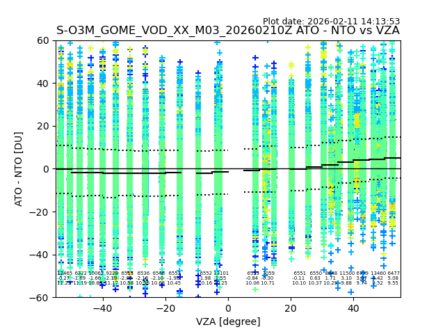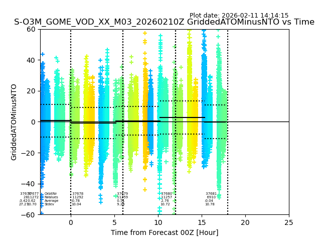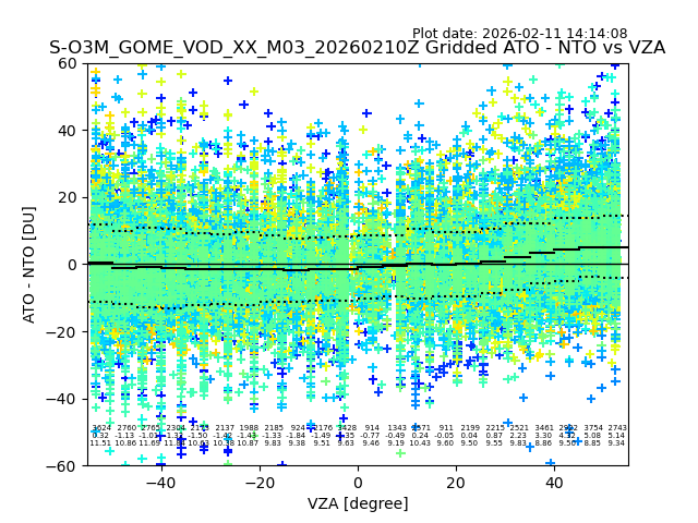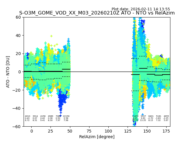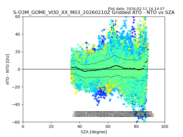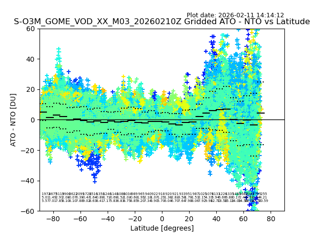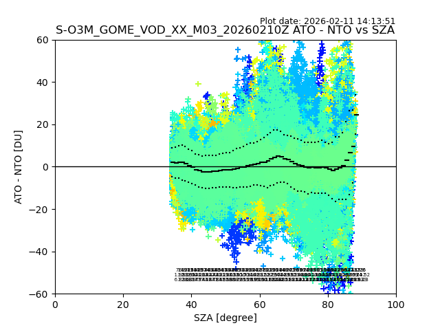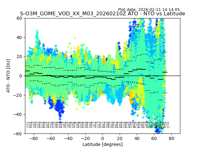 The date given in the title of the plot indicates the T=0 day for which the NTO/O3 data is compared. Example: S-O3M_GOME_VOD__M02_20110117Z indicates that the plot is for data from 2011-01-17 00:00 up NTO/O3 files starting at 2011-01-17 23:59 is used.