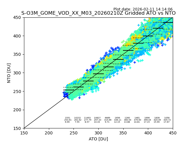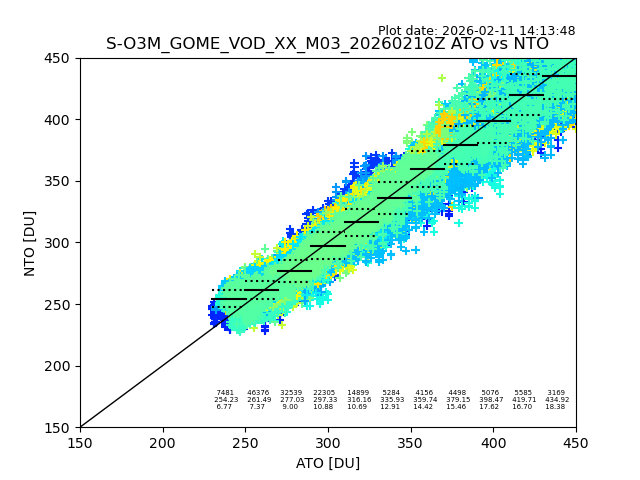 Using these forecast fields, the actual measured NTO/O3 from T=0 to T+24h can be compared. The comparison can be between each individual NTO/O3 retrieval and the ATO value in the associated grid box, or between 'pre-gridded' NTO/O3 values and the ATO value. Both these comparisons are given.