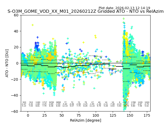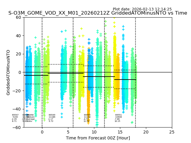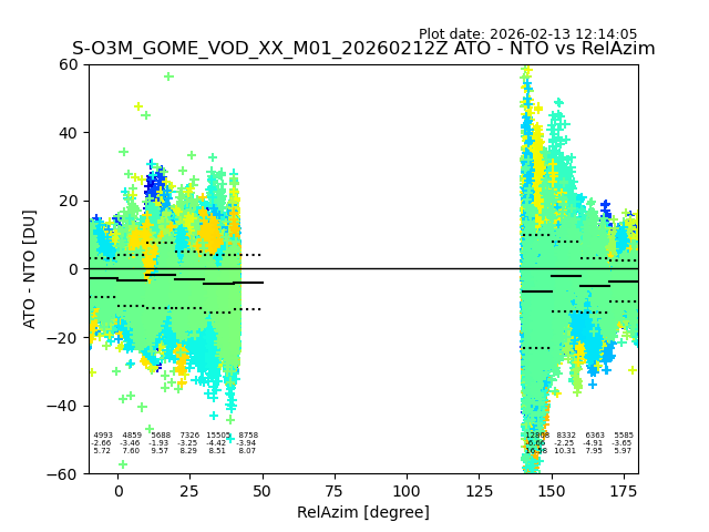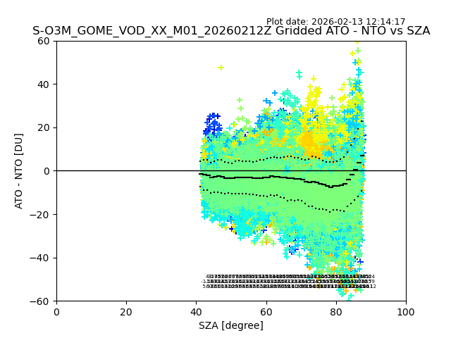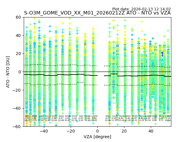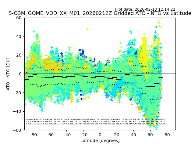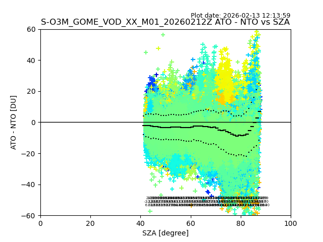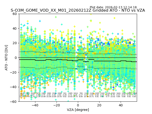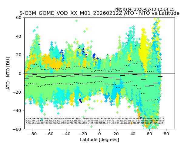 The date given in the title of the plot indicates the T=0 day for which the NTO/O3 data is compared. Example: S-O3M_GOME_VOD__M02_20110117Z indicates that the plot is for data from 2011-01-17 00:00 up NTO/O3 files starting at 2011-01-17 23:59 is used.