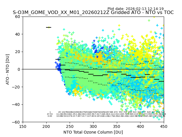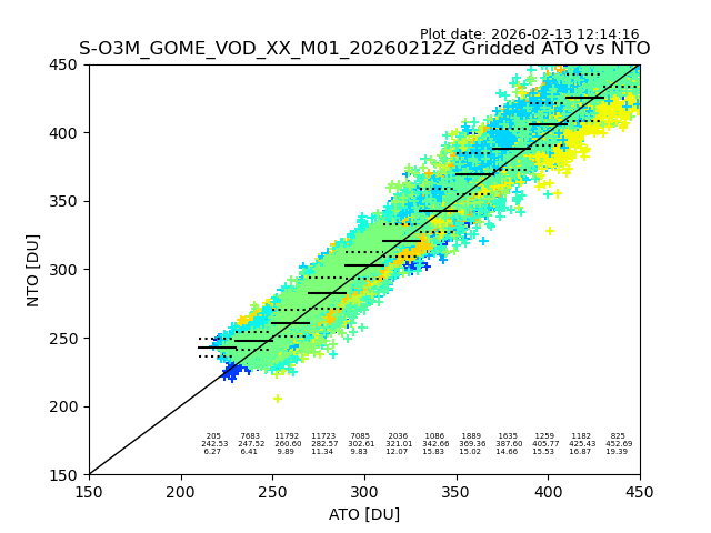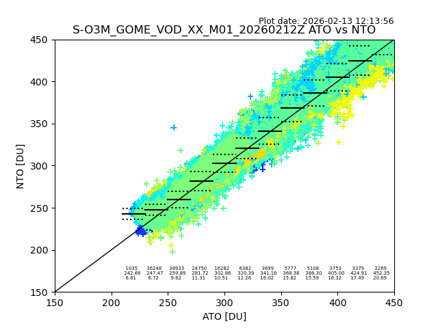 Using these forecast fields, the actual measured NTO/O3 from T=0 to T+24h can be compared. The comparison can be between each individual NTO/O3 retrieval and the ATO value in the associated grid box, or between 'pre-gridded' NTO/O3 values and the ATO value. Both these comparisons are given.