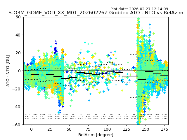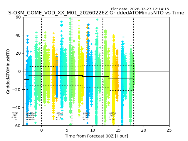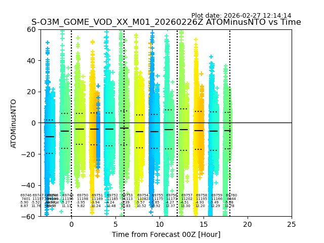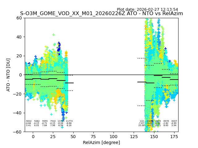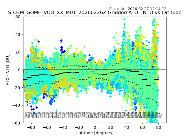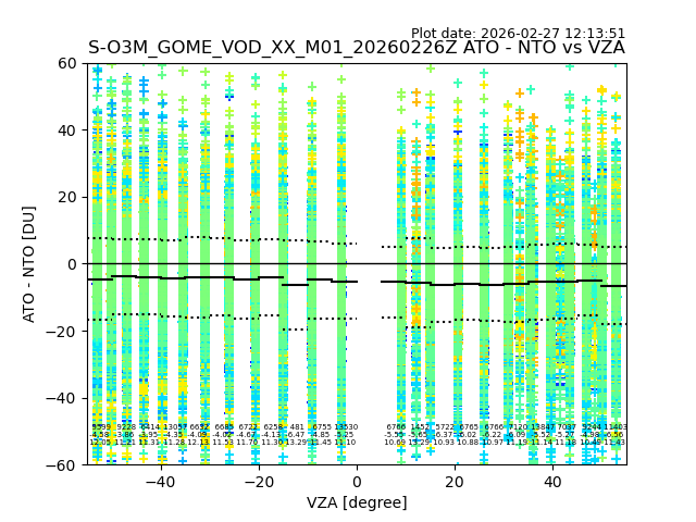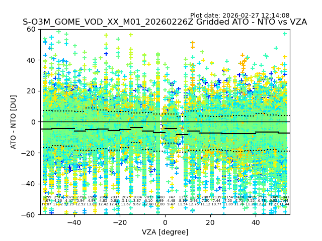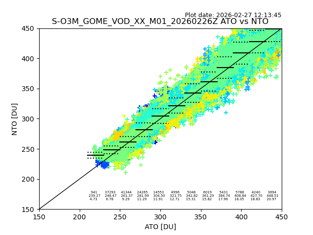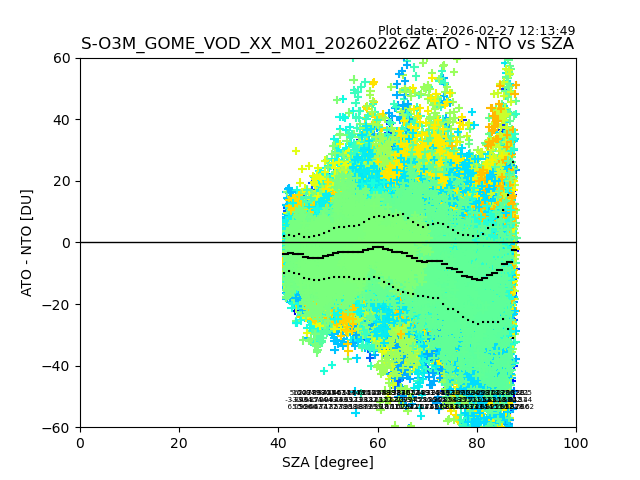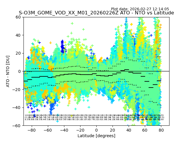 The date given in the title of the plot indicates the T=0 day for which the NTO/O3 data is compared. Example: S-O3M_GOME_VOD__M02_20110117Z indicates that the plot is for data from 2011-01-17 00:00 up NTO/O3 files starting at 2011-01-17 23:59 is used.