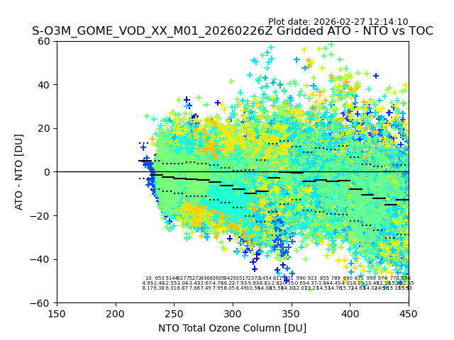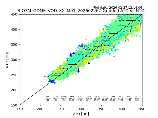 Using these forecast fields, the actual measured NTO/O3 from T=0 to T+24h can be compared. The comparison can be between each individual NTO/O3 retrieval and the ATO value in the associated grid box, or between 'pre-gridded' NTO/O3 values and the ATO value. Both these comparisons are given.