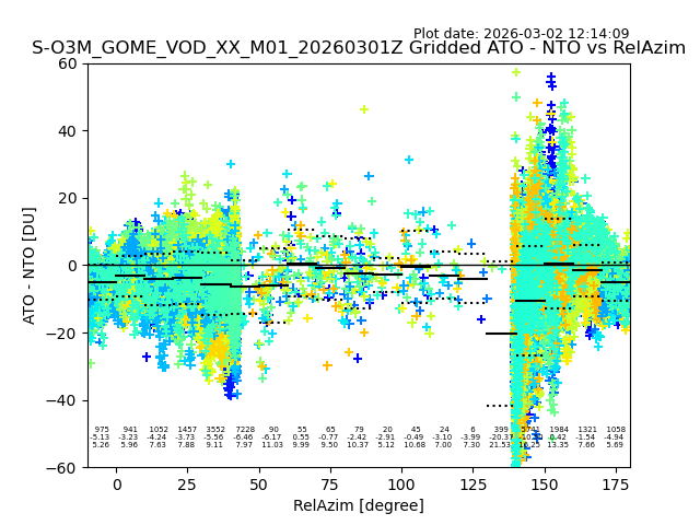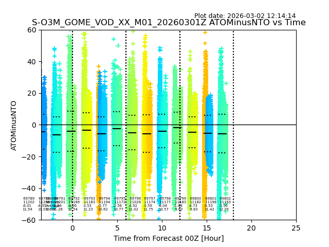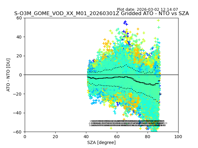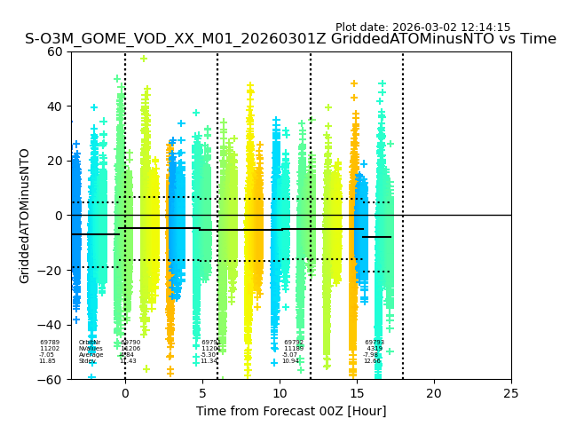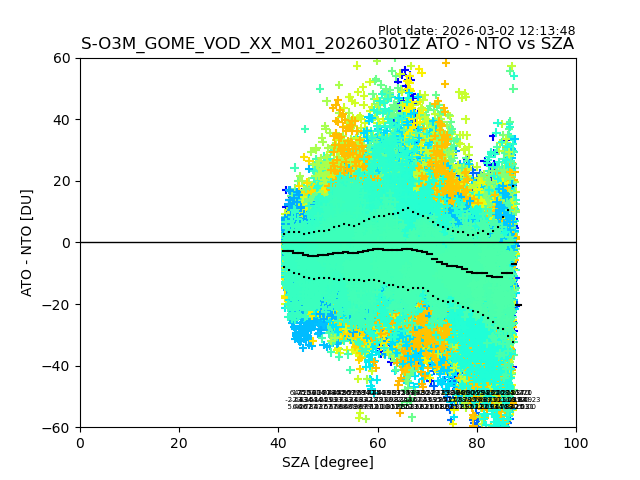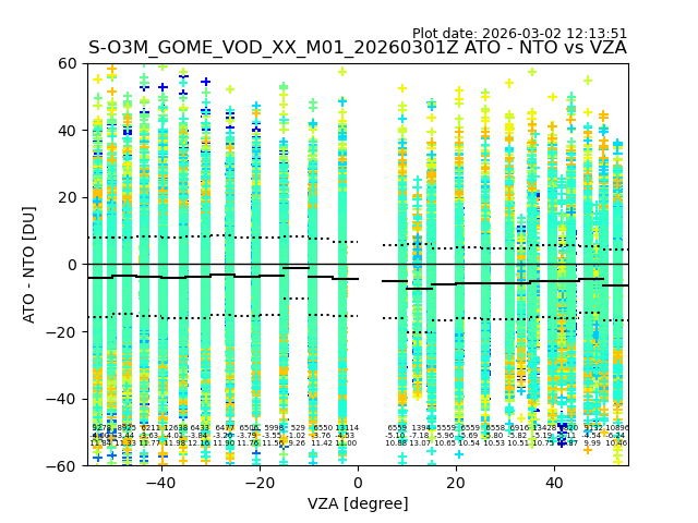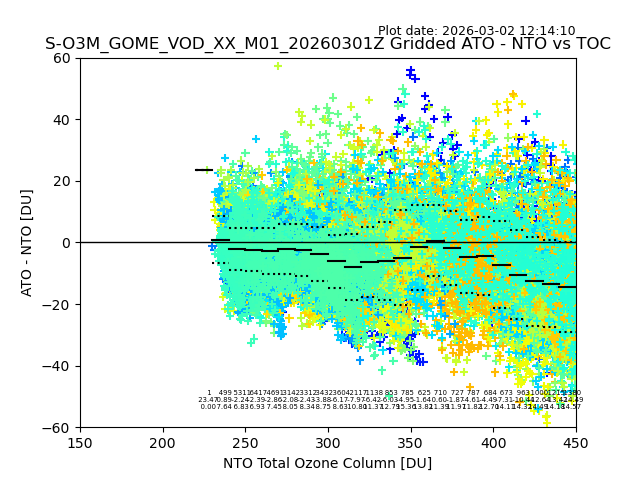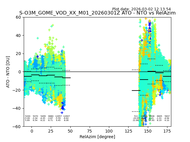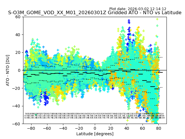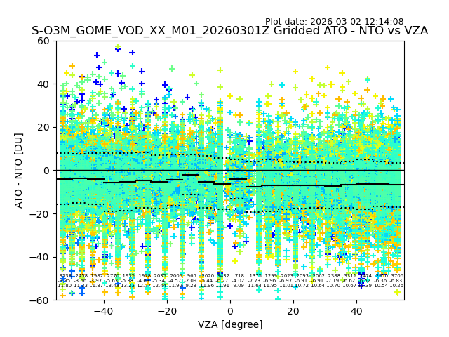 The date given in the title of the plot indicates the T=0 day for which the NTO/O3 data is compared. Example: S-O3M_GOME_VOD__M02_20110117Z indicates that the plot is for data from 2011-01-17 00:00 up NTO/O3 files starting at 2011-01-17 23:59 is used.