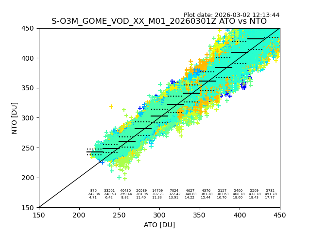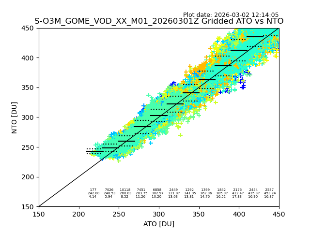 Using these forecast fields, the actual measured NTO/O3 from T=0 to T+24h can be compared. The comparison can be between each individual NTO/O3 retrieval and the ATO value in the associated grid box, or between 'pre-gridded' NTO/O3 values and the ATO value. Both these comparisons are given.