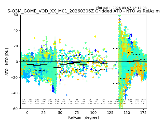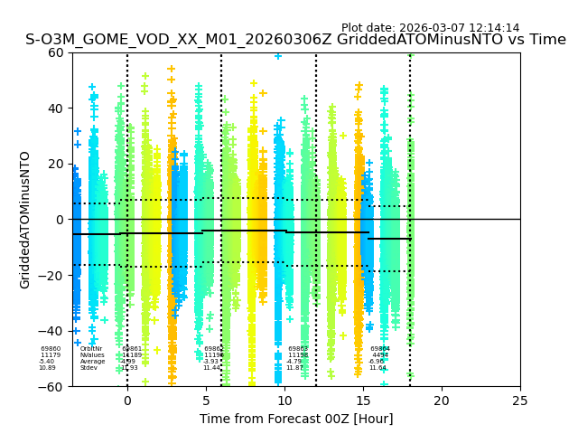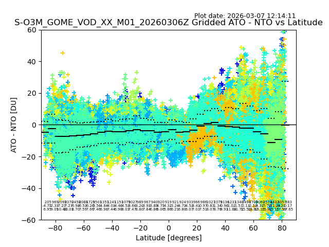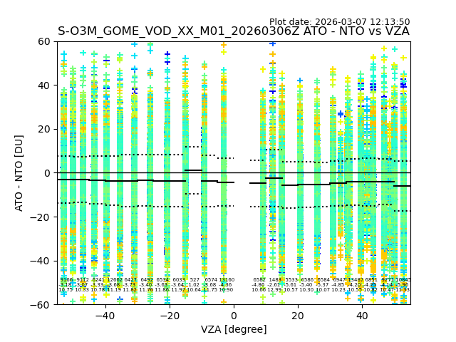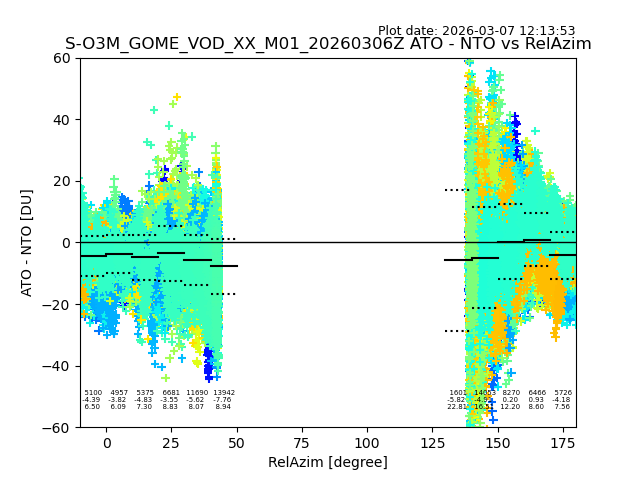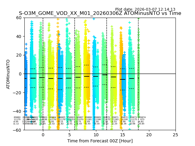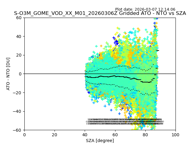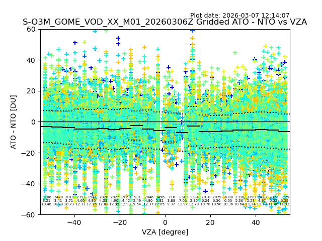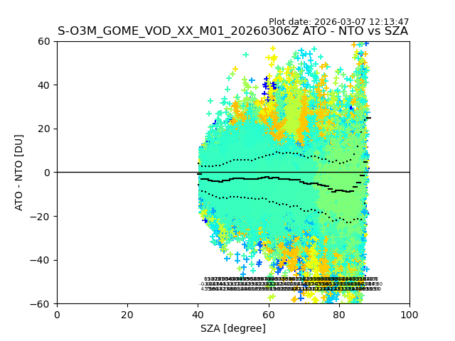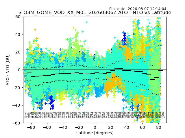The date given in the title of the plot indicates the T=0 day for which the NTO/O3 data is compared. Example: S-O3M_GOME_VOD__M02_20110117Z indicates that the plot is for data from 2011-01-17 00:00 up NTO/O3 files starting at 2011-01-17 23:59 is used.