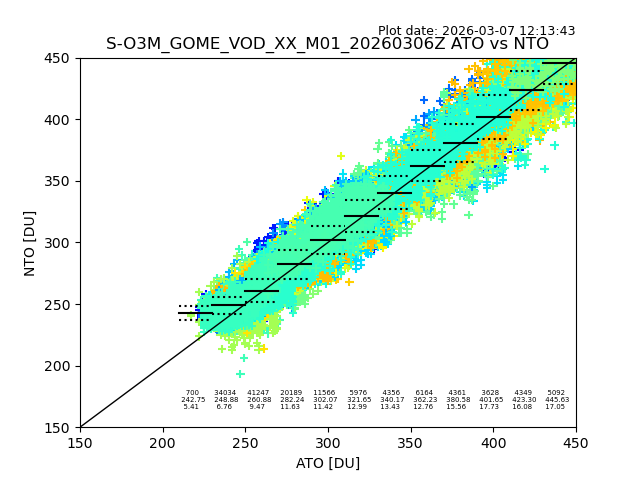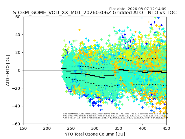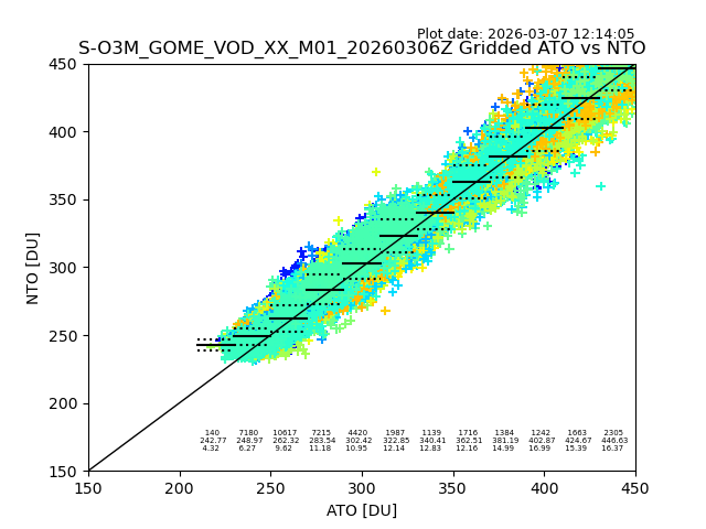 Using these forecast fields, the actual measured NTO/O3 from T=0 to T+24h can be compared. The comparison can be between each individual NTO/O3 retrieval and the ATO value in the associated grid box, or between 'pre-gridded' NTO/O3 values and the ATO value. Both these comparisons are given.
