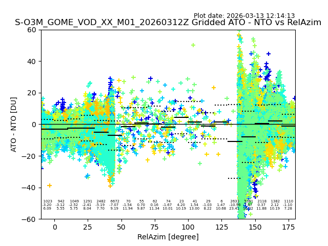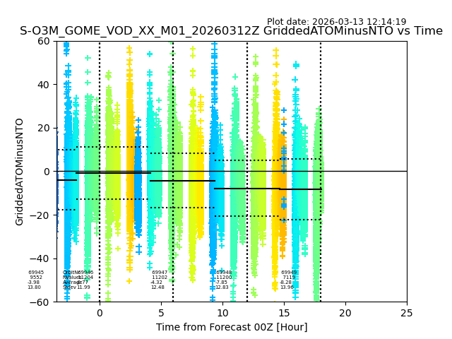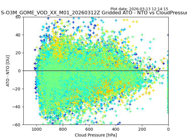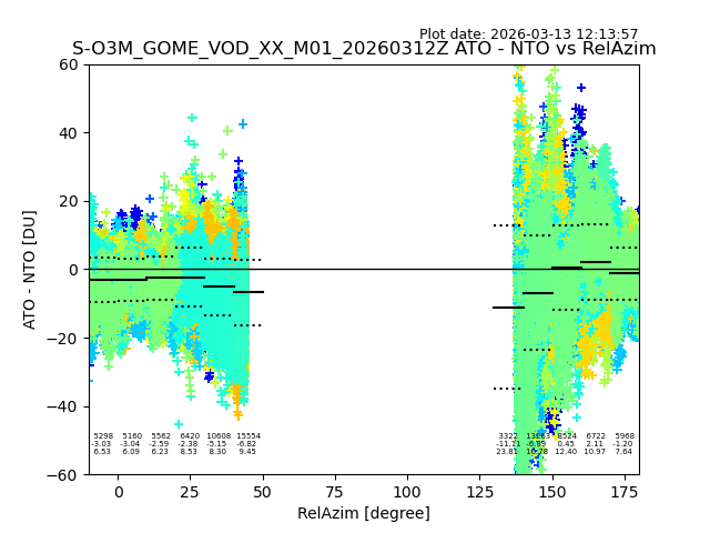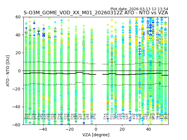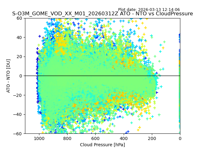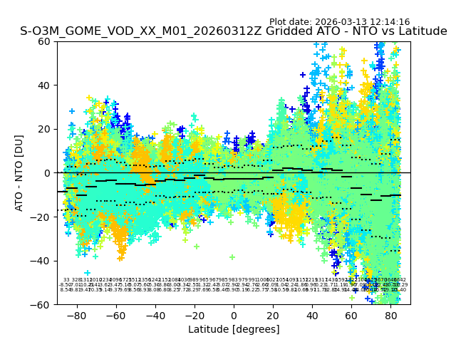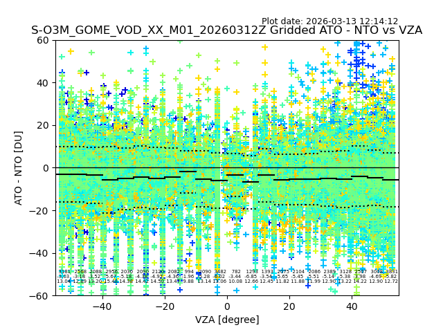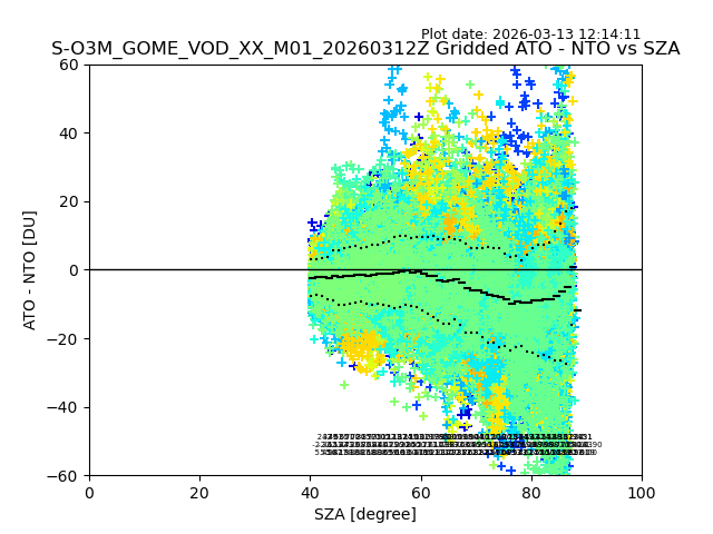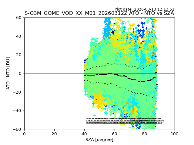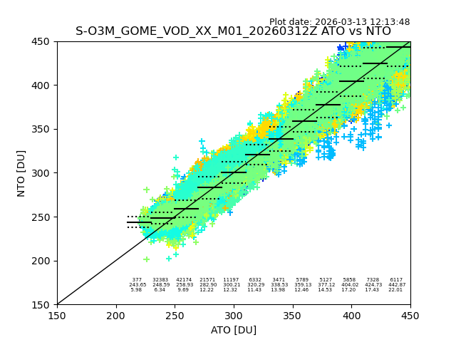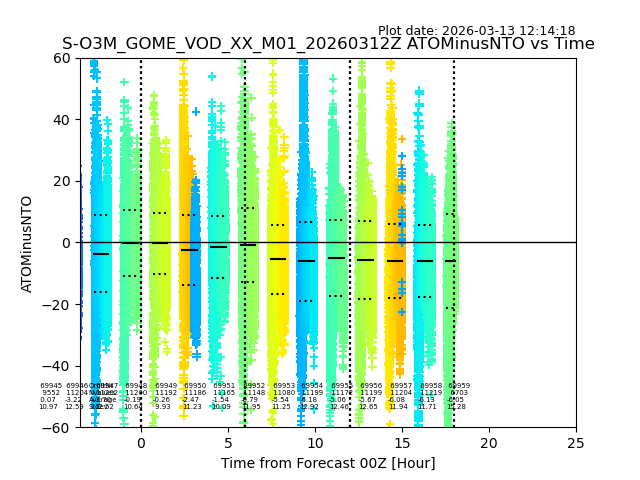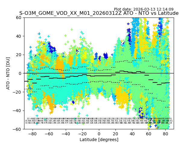 The date given in the title of the plot indicates the T=0 day for which the NTO/O3 data is compared. Example: S-O3M_GOME_VOD__M02_20110117Z indicates that the plot is for data from 2011-01-17 00:00 up NTO/O3 files starting at 2011-01-17 23:59 is used.