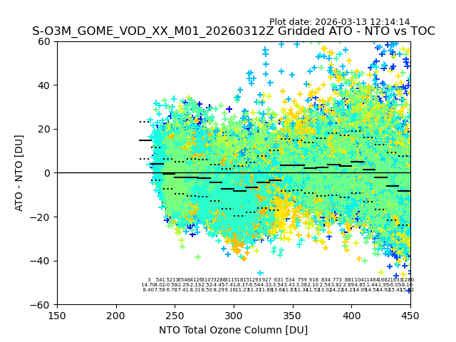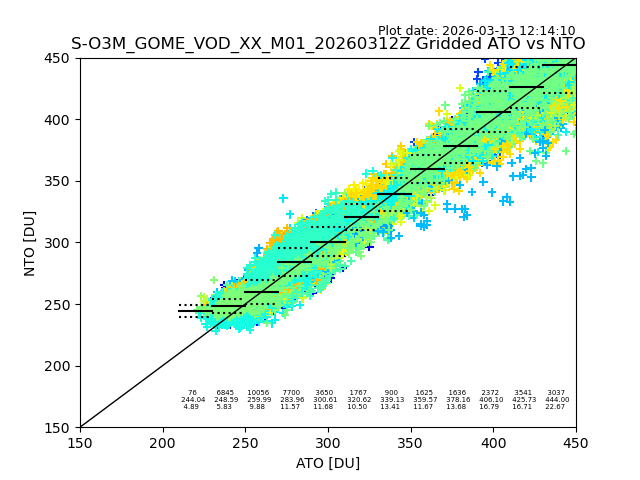 Using these forecast fields, the actual measured NTO/O3 from T=0 to T+24h can be compared. The comparison can be between each individual NTO/O3 retrieval and the ATO value in the associated grid box, or between 'pre-gridded' NTO/O3 values and the ATO value. Both these comparisons are given.