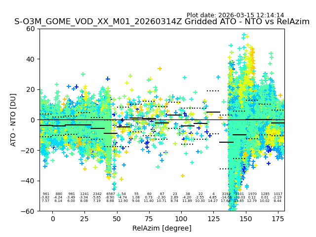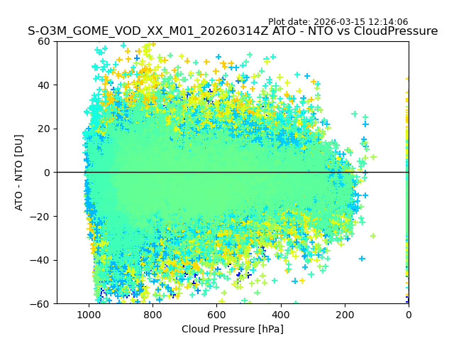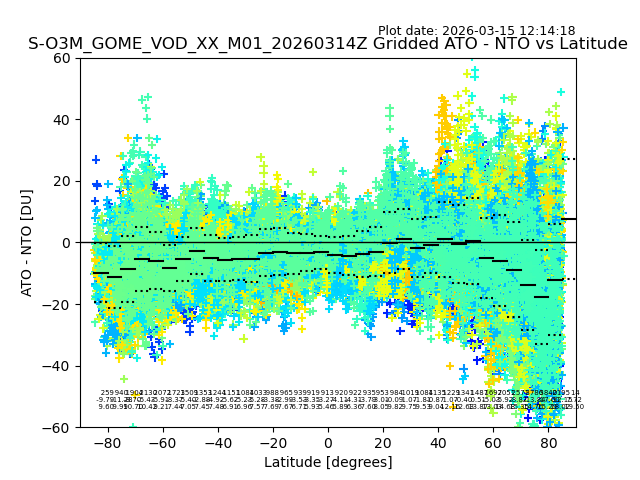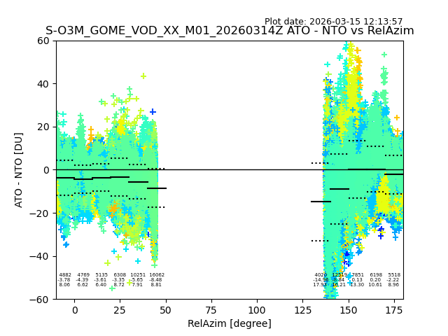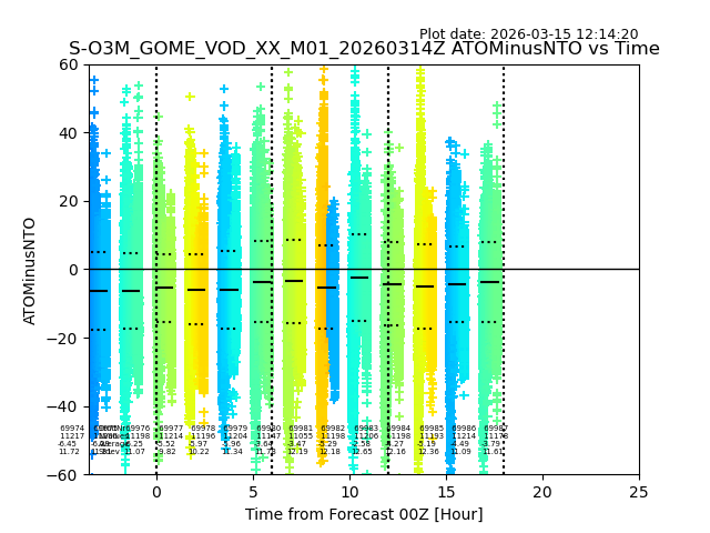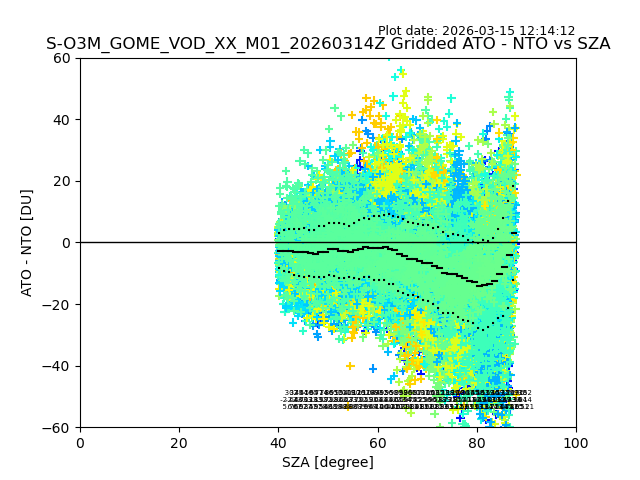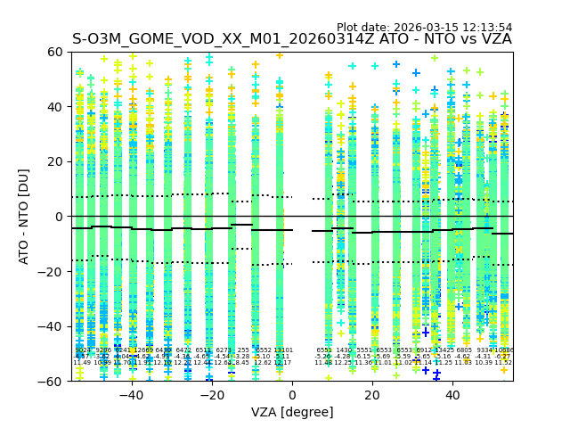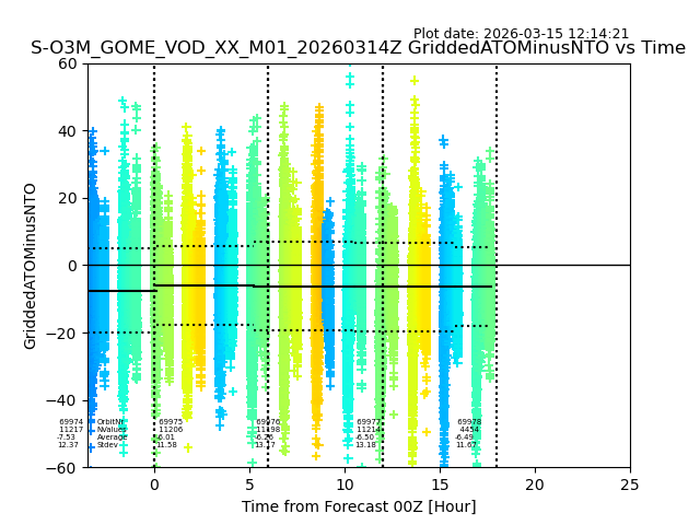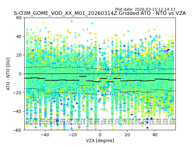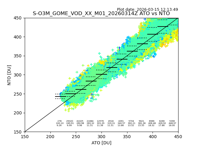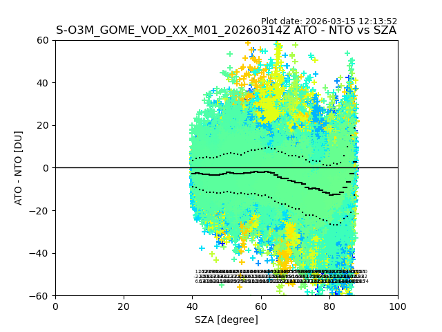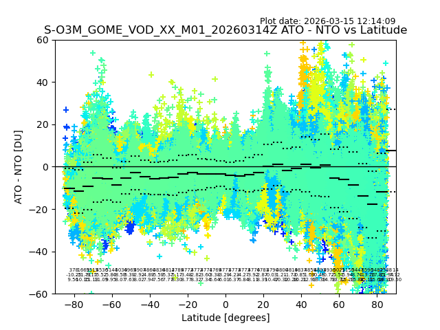 The date given in the title of the plot indicates the T=0 day for which the NTO/O3 data is compared. Example: S-O3M_GOME_VOD__M02_20110117Z indicates that the plot is for data from 2011-01-17 00:00 up NTO/O3 files starting at 2011-01-17 23:59 is used.