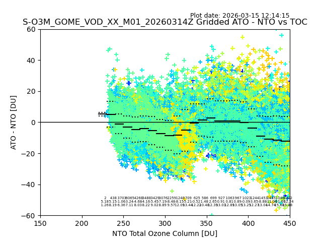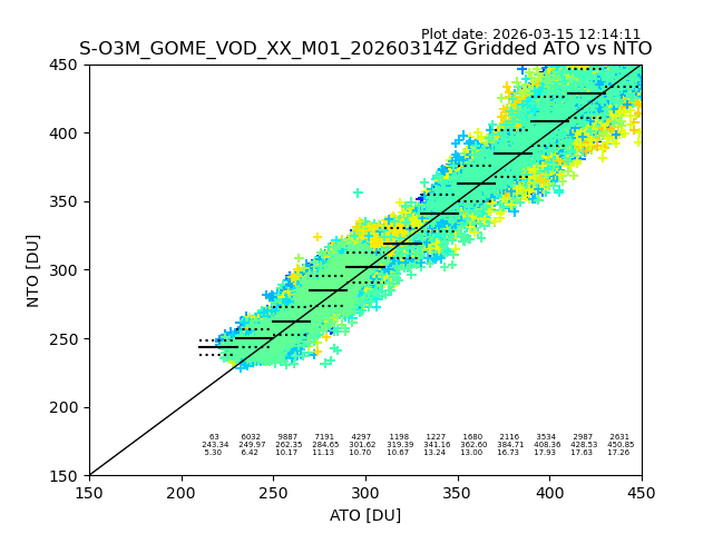 Using these forecast fields, the actual measured NTO/O3 from T=0 to T+24h can be compared. The comparison can be between each individual NTO/O3 retrieval and the ATO value in the associated grid box, or between 'pre-gridded' NTO/O3 values and the ATO value. Both these comparisons are given.
