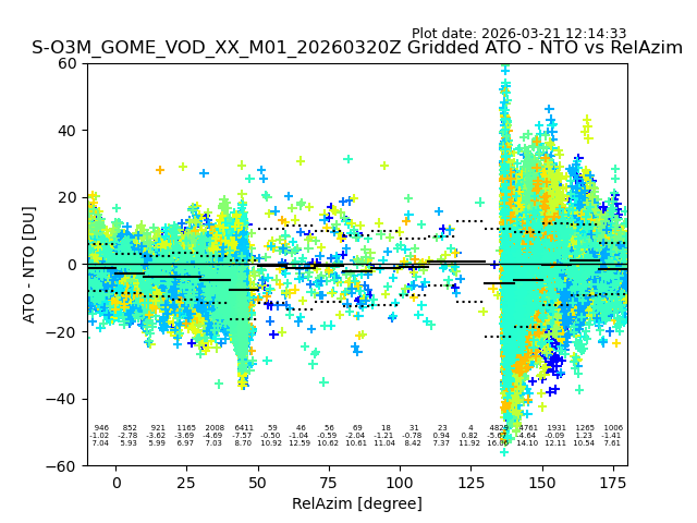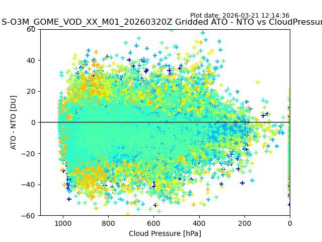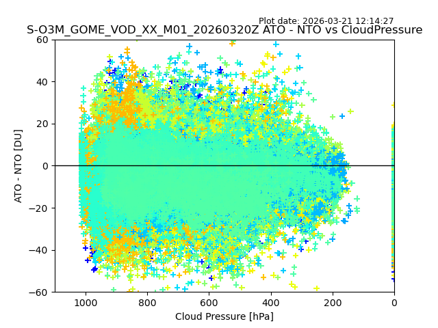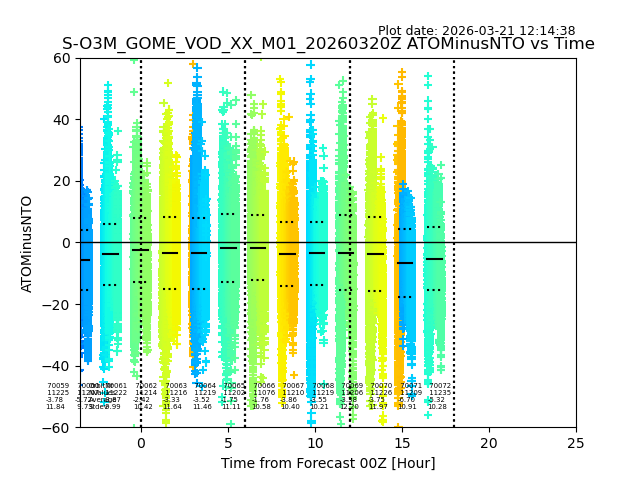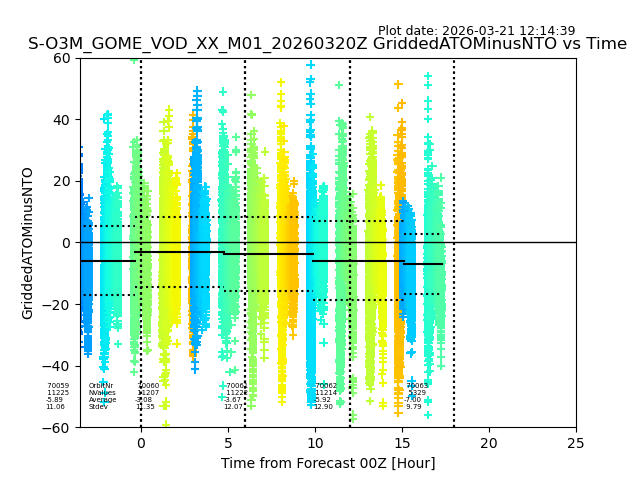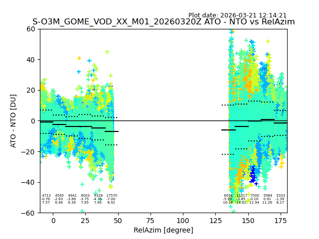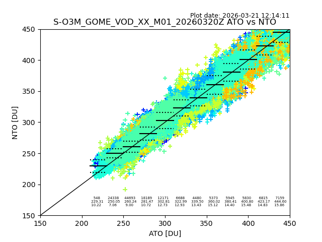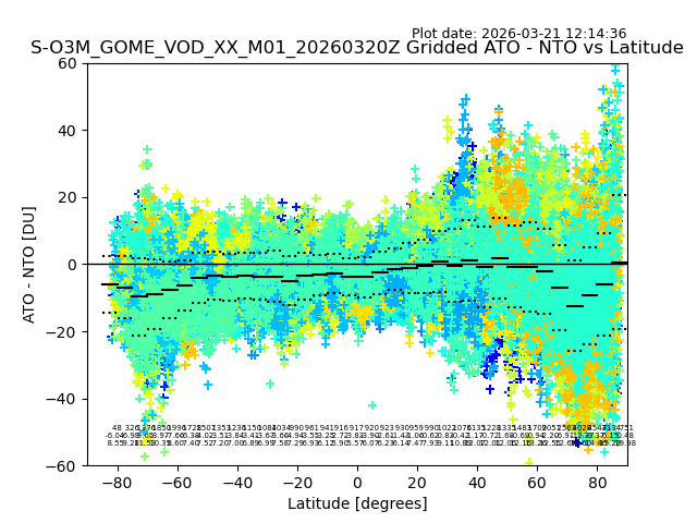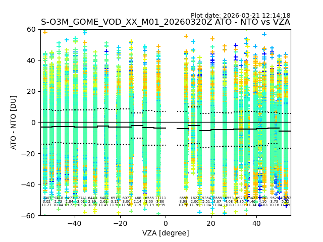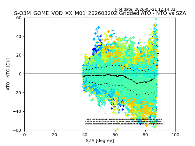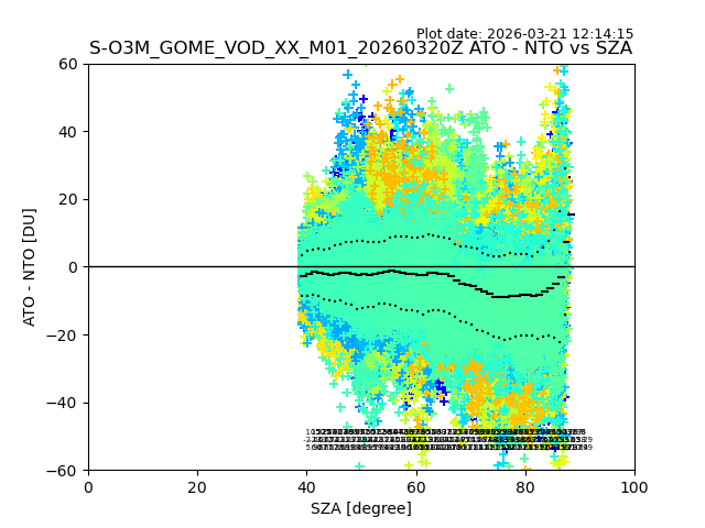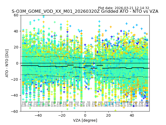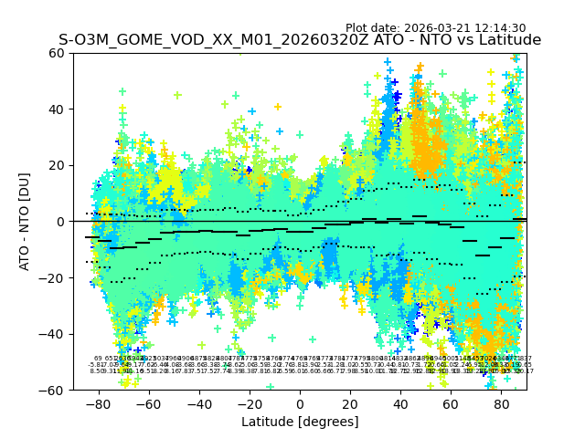 The date given in the title of the plot indicates the T=0 day for which the NTO/O3 data is compared. Example: S-O3M_GOME_VOD__M02_20110117Z indicates that the plot is for data from 2011-01-17 00:00 up NTO/O3 files starting at 2011-01-17 23:59 is used.
