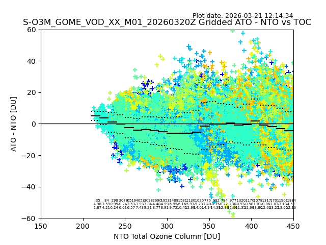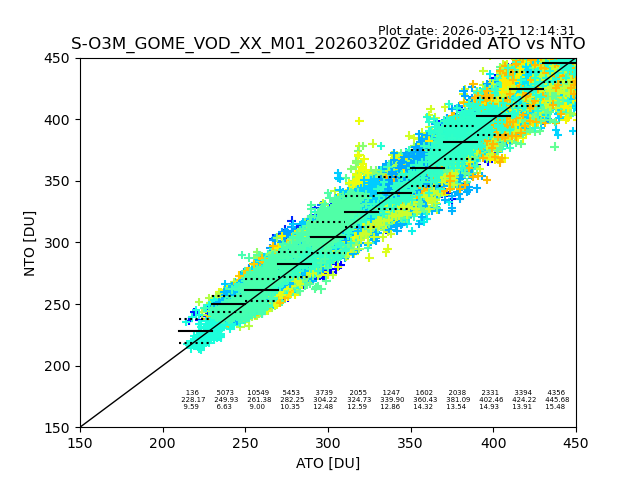 Using these forecast fields, the actual measured NTO/O3 from T=0 to T+24h can be compared. The comparison can be between each individual NTO/O3 retrieval and the ATO value in the associated grid box, or between 'pre-gridded' NTO/O3 values and the ATO value. Both these comparisons are given.