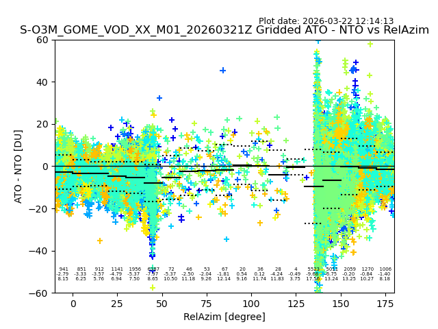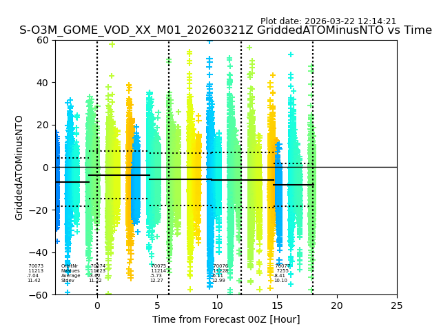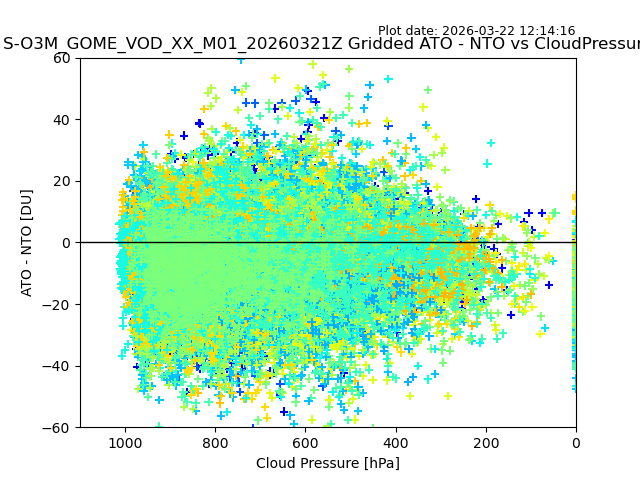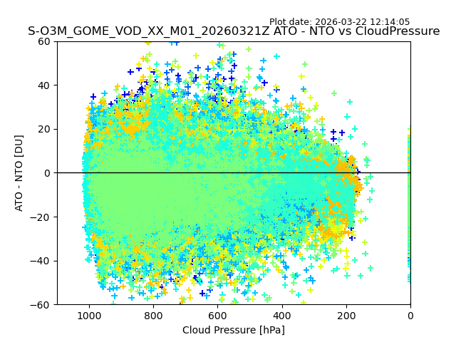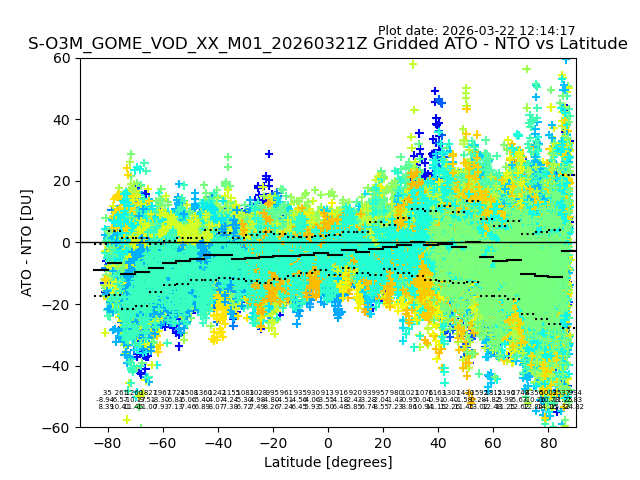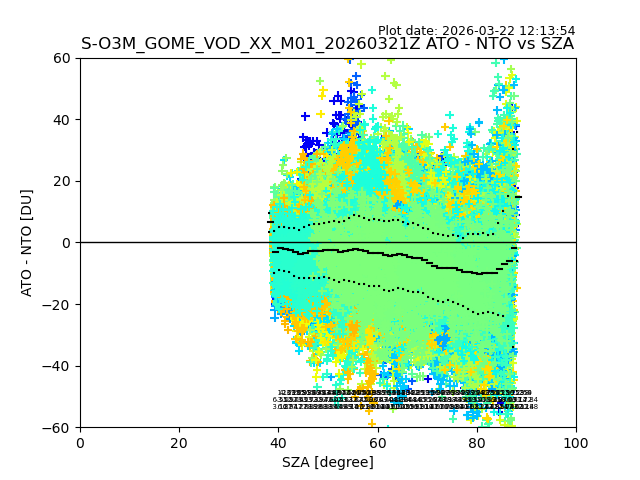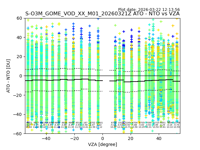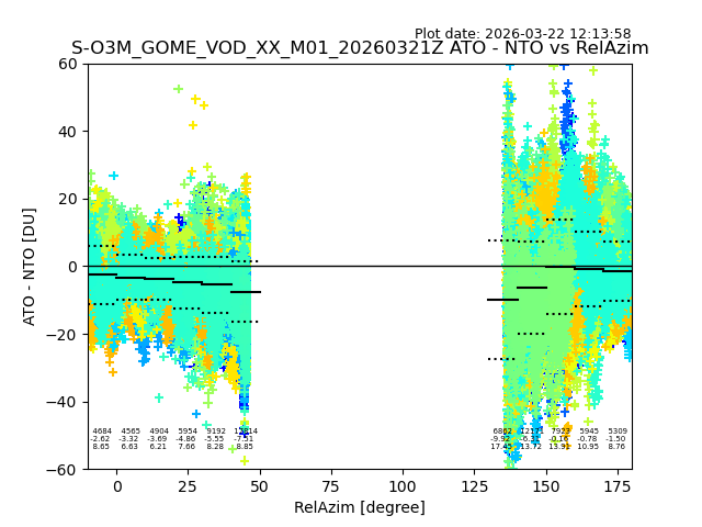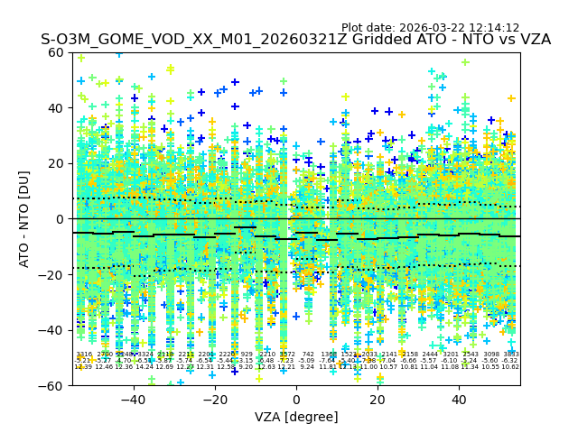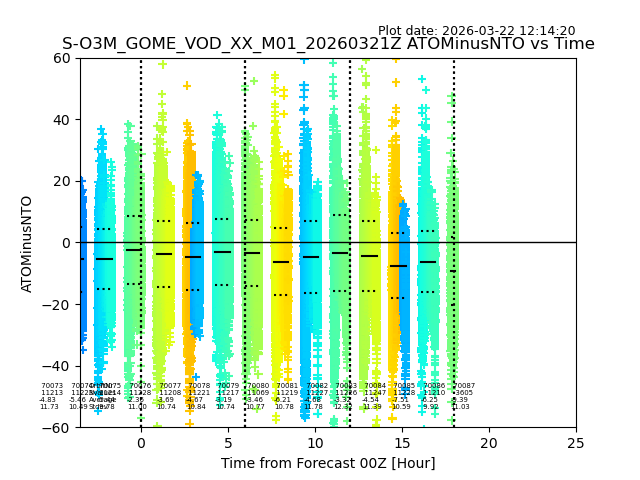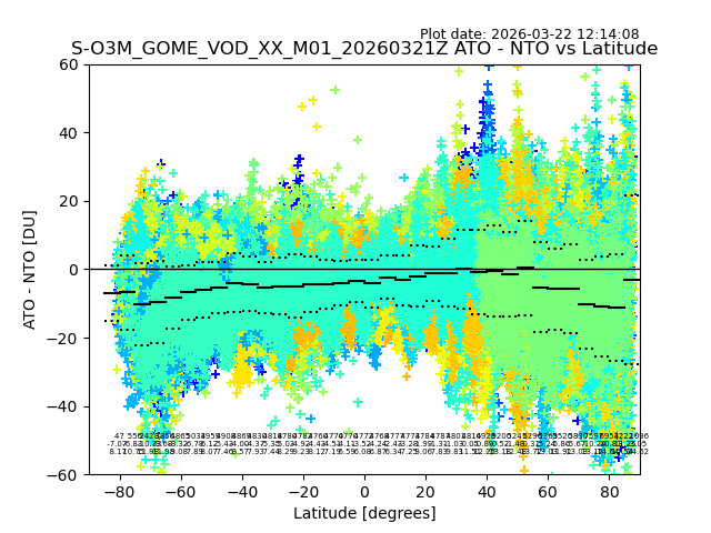 The date given in the title of the plot indicates the T=0 day for which the NTO/O3 data is compared. Example: S-O3M_GOME_VOD__M02_20110117Z indicates that the plot is for data from 2011-01-17 00:00 up NTO/O3 files starting at 2011-01-17 23:59 is used.