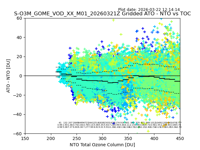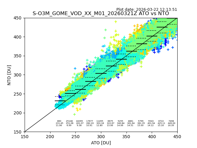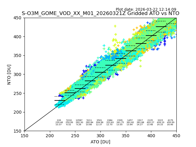 Using these forecast fields, the actual measured NTO/O3 from T=0 to T+24h can be compared. The comparison can be between each individual NTO/O3 retrieval and the ATO value in the associated grid box, or between 'pre-gridded' NTO/O3 values and the ATO value. Both these comparisons are given.