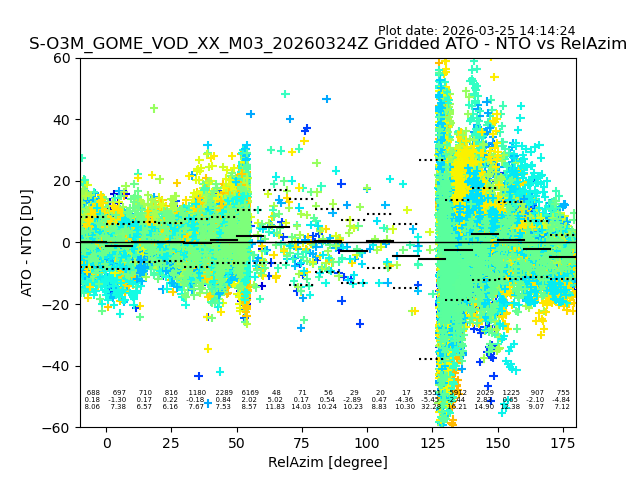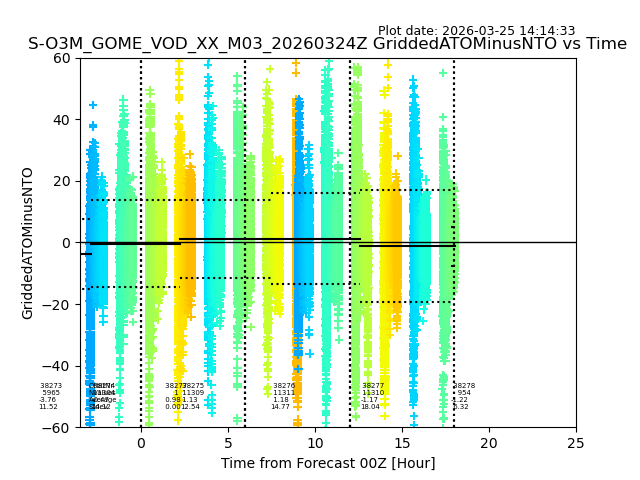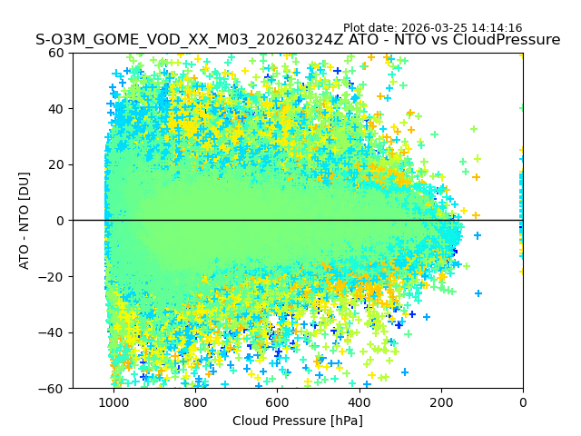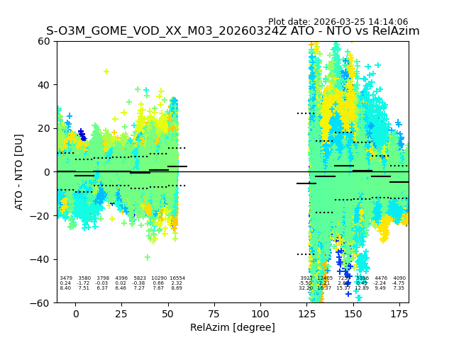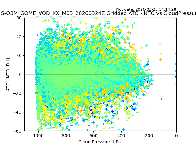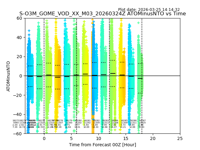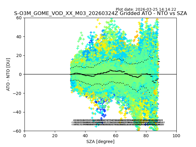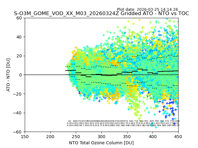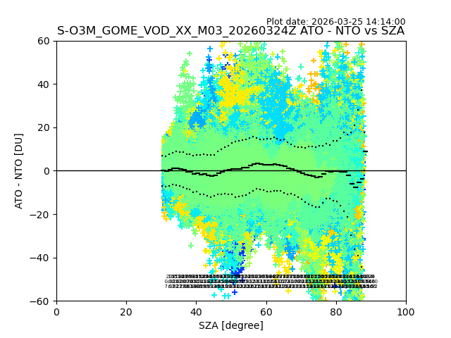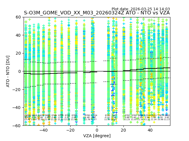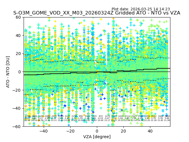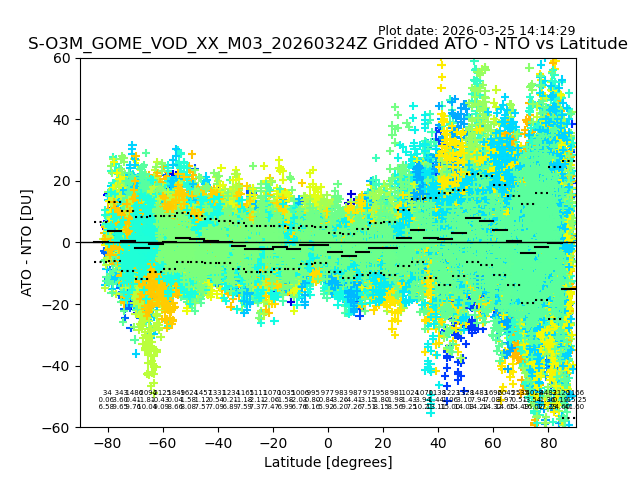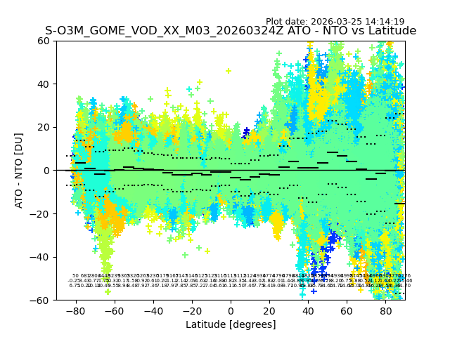 The date given in the title of the plot indicates the T=0 day for which the NTO/O3 data is compared. Example: S-O3M_GOME_VOD__M02_20110117Z indicates that the plot is for data from 2011-01-17 00:00 up NTO/O3 files starting at 2011-01-17 23:59 is used.