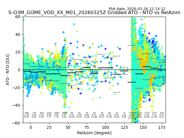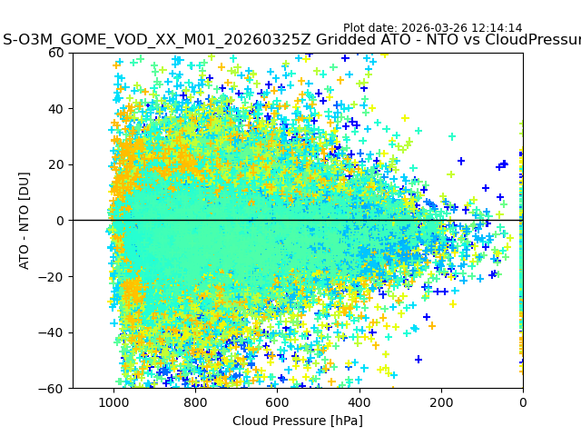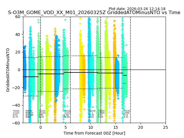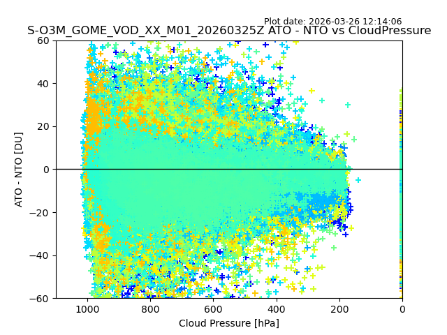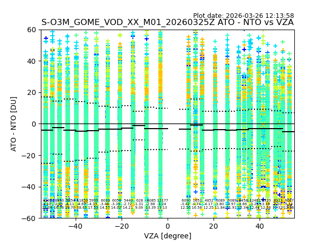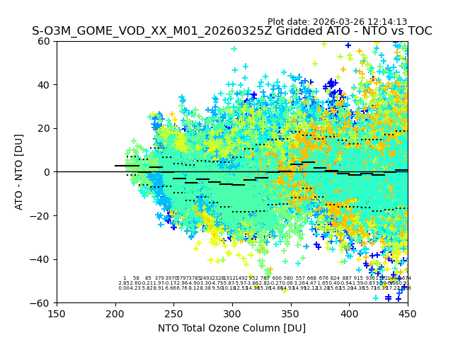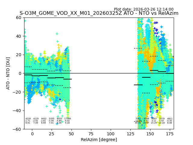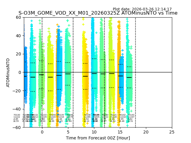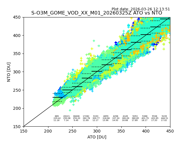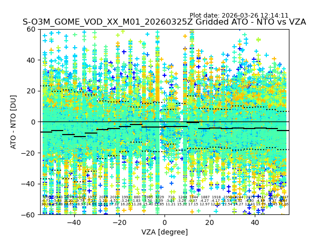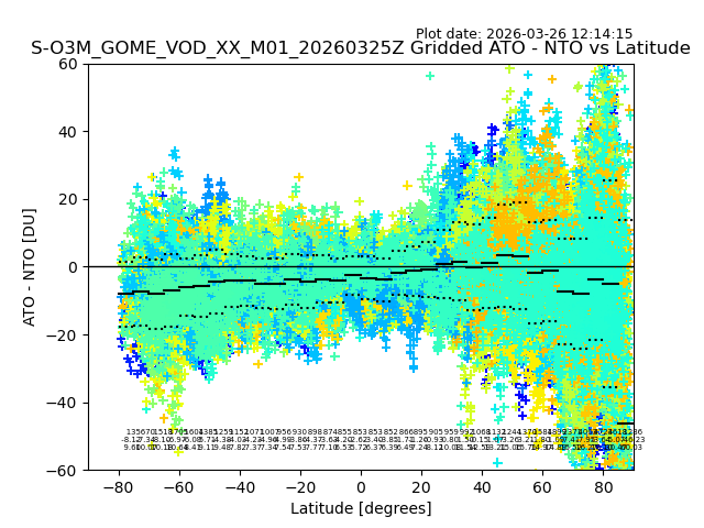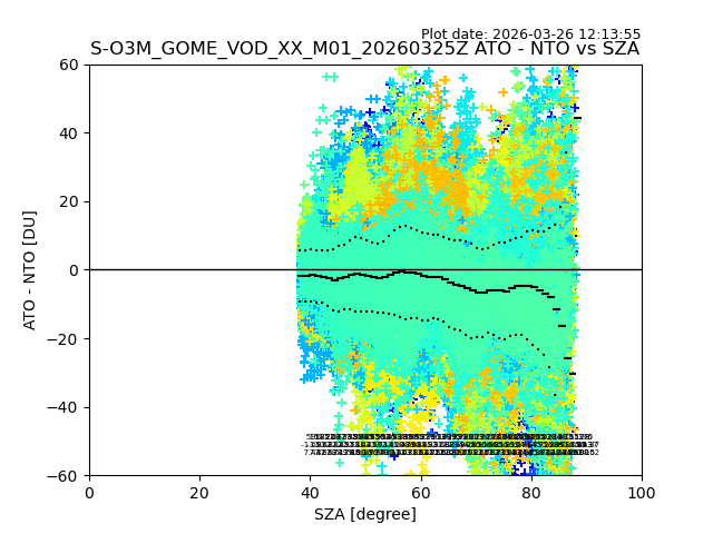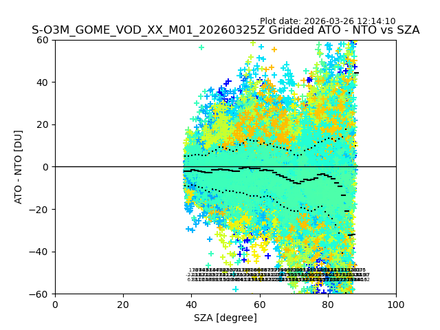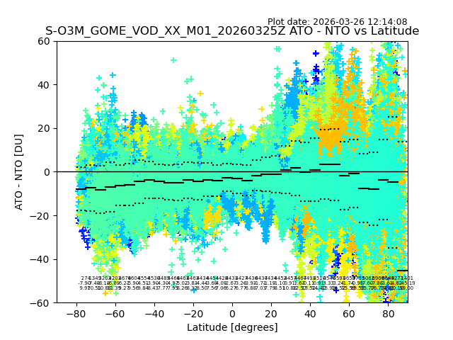The date given in the title of the plot indicates the T=0 day for which the NTO/O3 data is compared. Example: S-O3M_GOME_VOD__M02_20110117Z indicates that the plot is for data from 2011-01-17 00:00 up NTO/O3 files starting at 2011-01-17 23:59 is used.