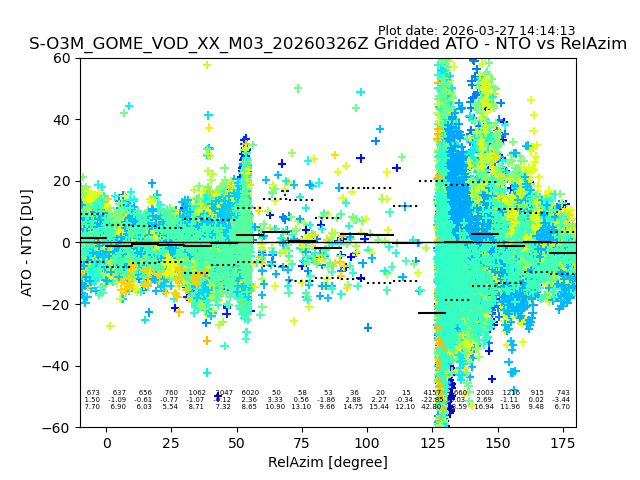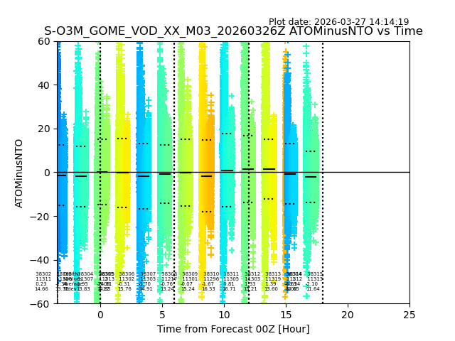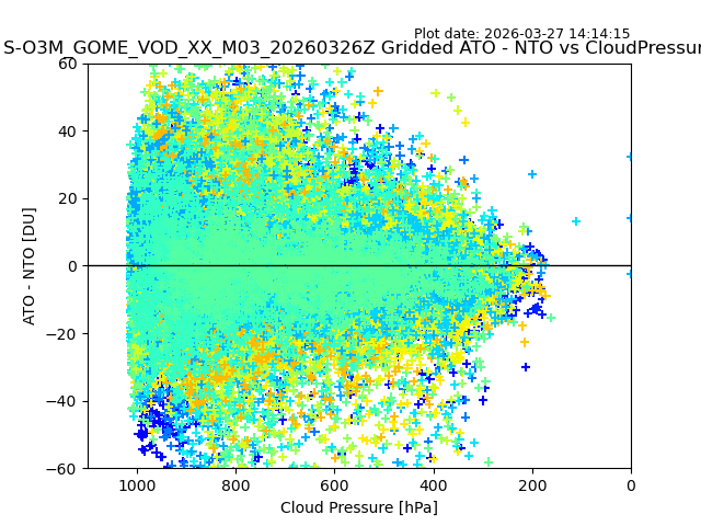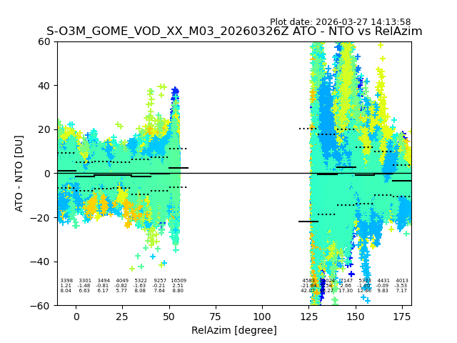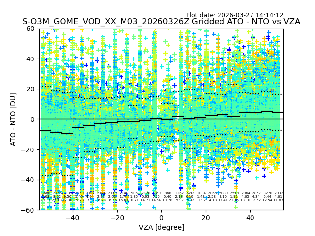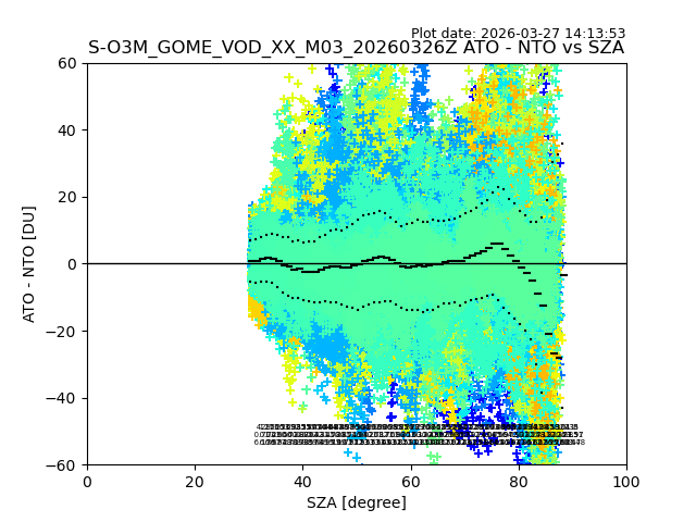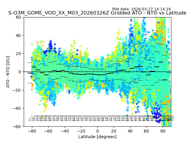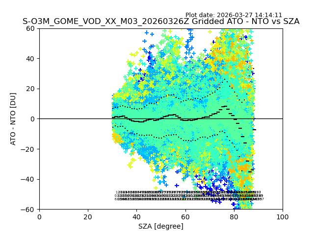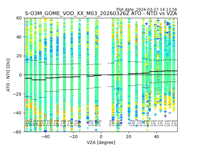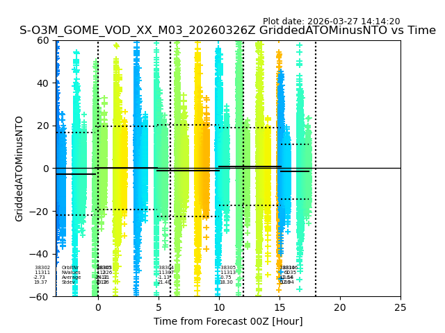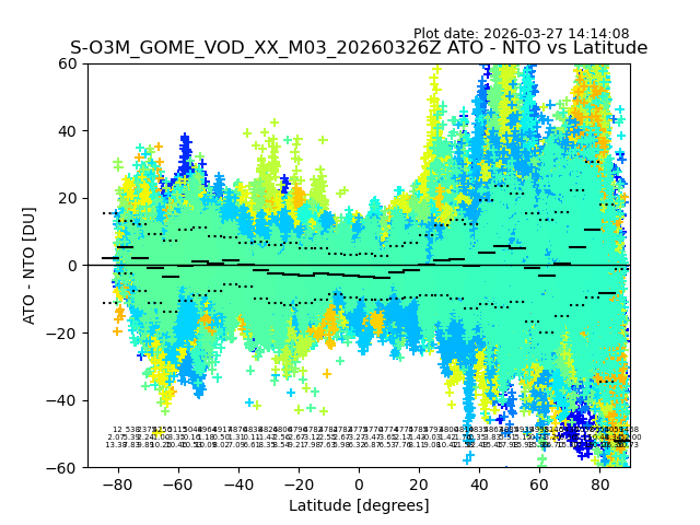 The date given in the title of the plot indicates the T=0 day for which the NTO/O3 data is compared. Example: S-O3M_GOME_VOD__M02_20110117Z indicates that the plot is for data from 2011-01-17 00:00 up NTO/O3 files starting at 2011-01-17 23:59 is used.