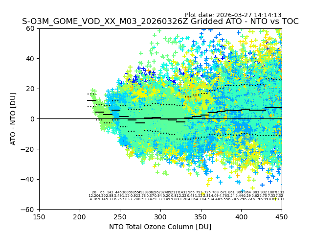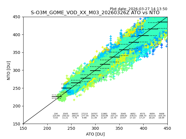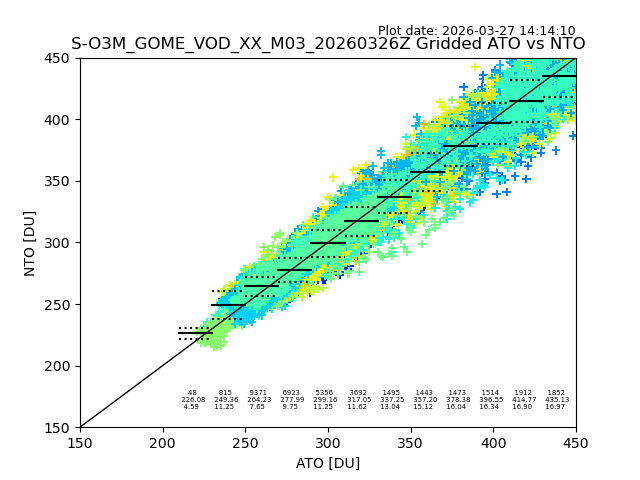 Using these forecast fields, the actual measured NTO/O3 from T=0 to T+24h can be compared. The comparison can be between each individual NTO/O3 retrieval and the ATO value in the associated grid box, or between 'pre-gridded' NTO/O3 values and the ATO value. Both these comparisons are given.