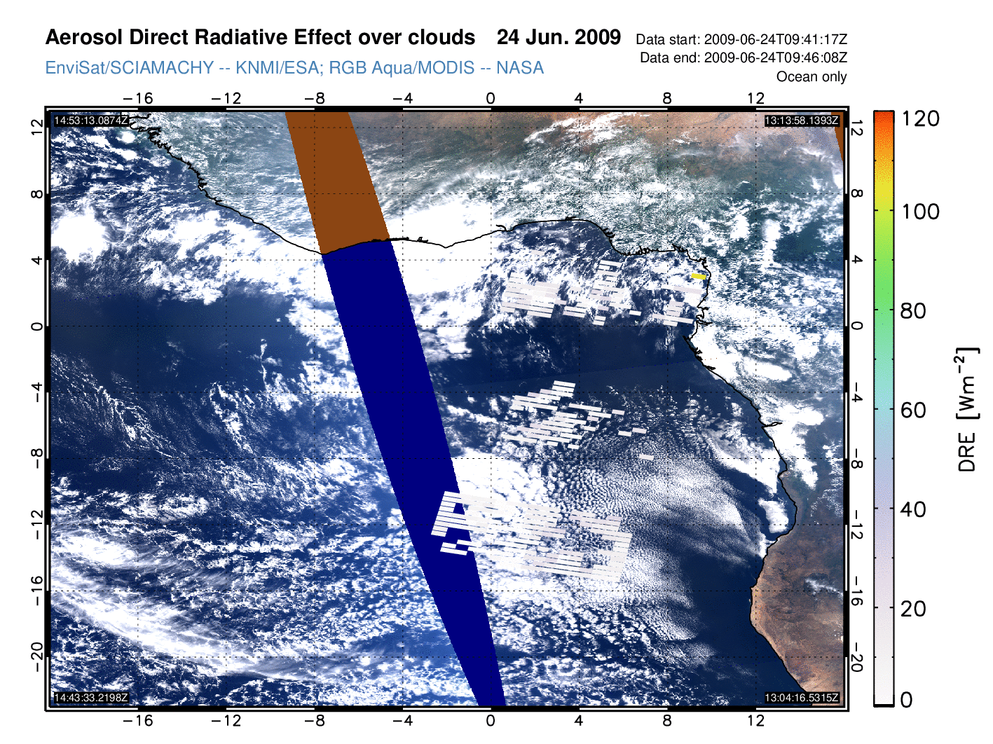 Aerosol DRE over clouds for 24 June 2009
