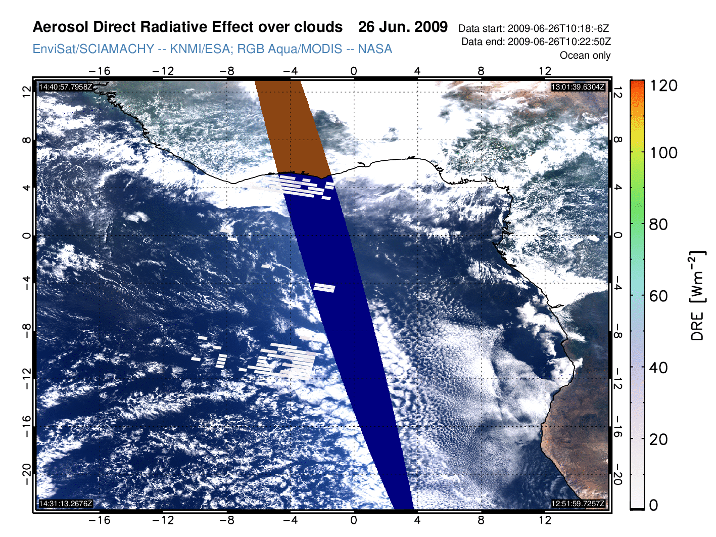 Aerosol DRE over clouds for 26 June 2009