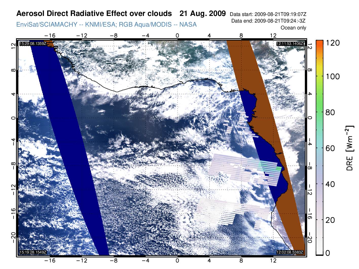Aerosol DRE over clouds for 21 August 2009