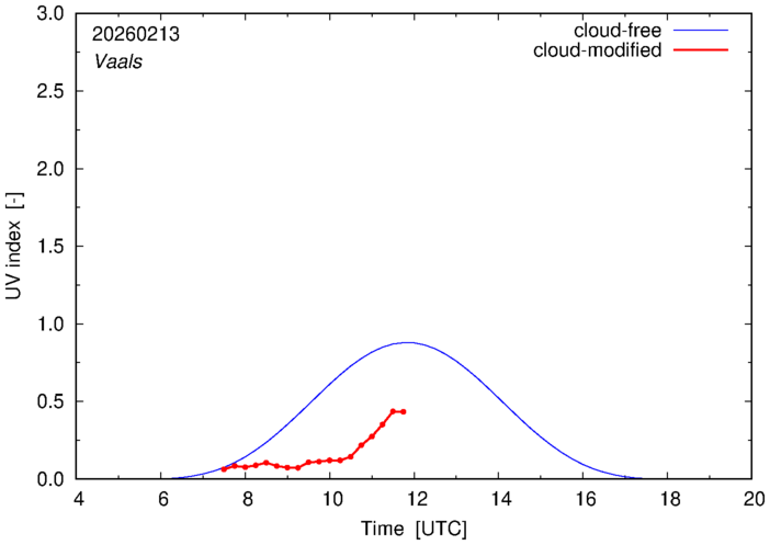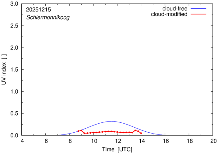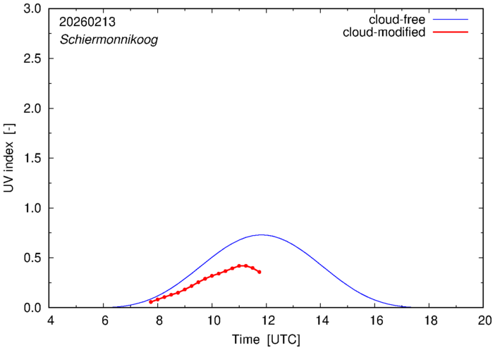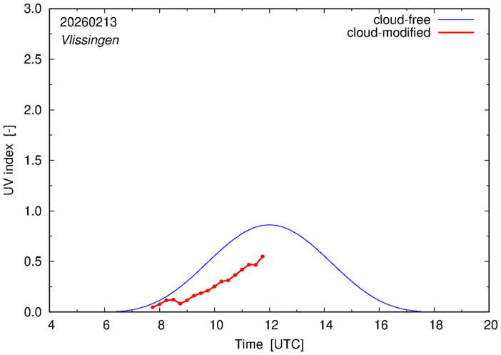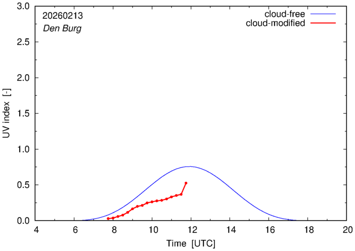 The plots on this page show for selected places in The Netherlands the UV index throughout the day, both cloud-free (thin blue line) and cloud-modified (red line/points) -- if the latter is absent, then cloud cover data is not available.