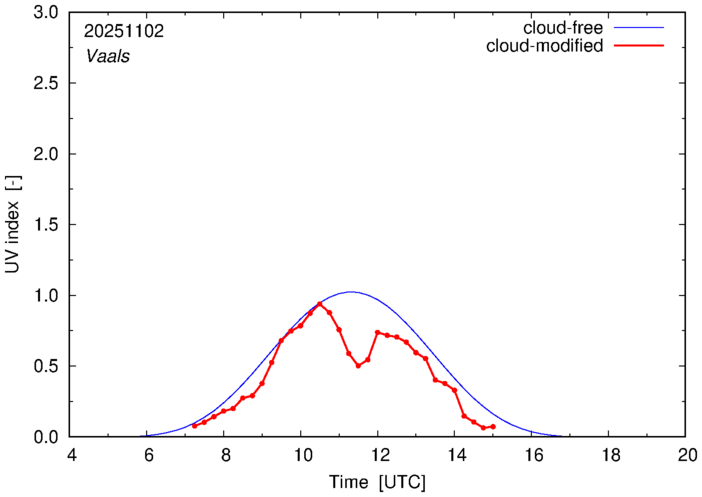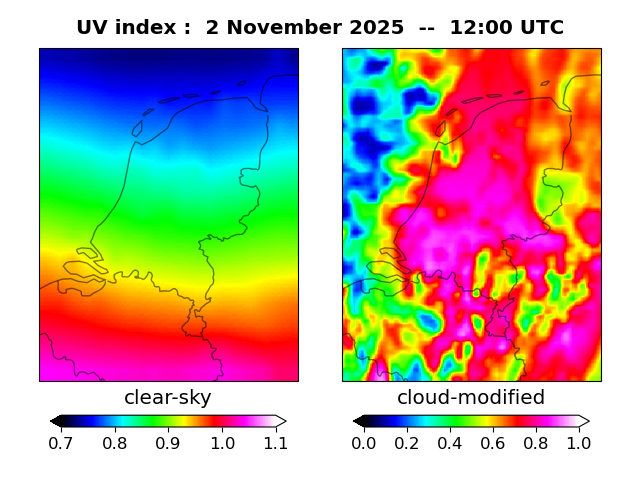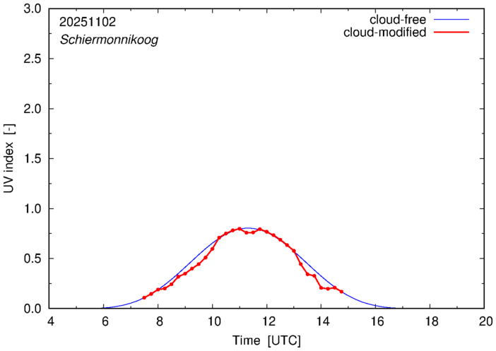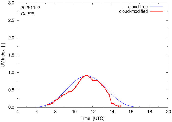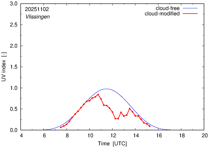 The plots on this page show for selected places in The Netherlands the UV index throughout the day, both cloud-free (thin blue line) and cloud-modified (red line/points) -- if the latter is absent, then cloud cover data is not available.