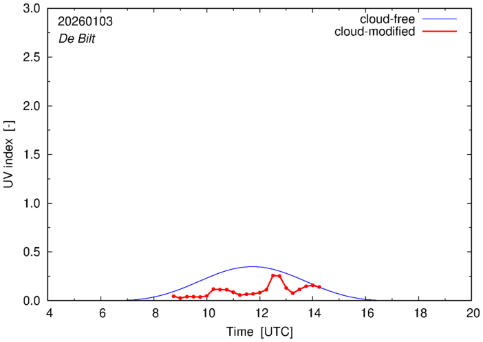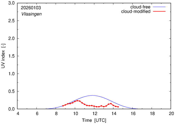 The plots on this page show for selected places in The Netherlands the UV index throughout the day, both cloud-free (thin blue line) and cloud-modified (red line/points) -- if the latter is absent, then cloud cover data is not available.