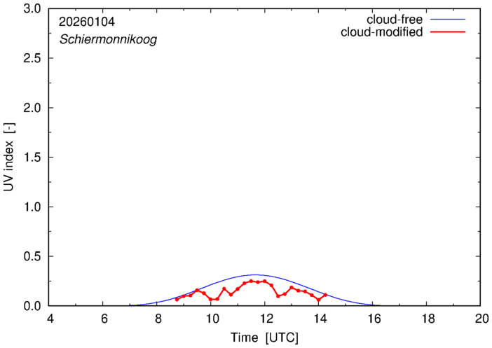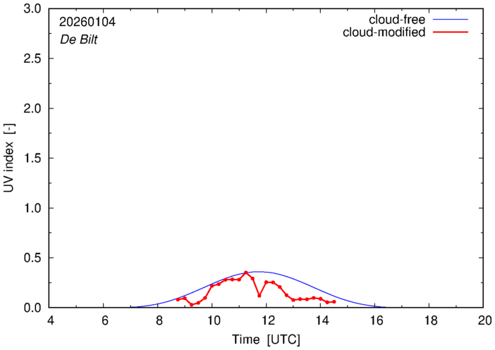 The plots on this page show for selected places in The Netherlands the UV index throughout the day, both cloud-free (thin blue line) and cloud-modified (red line/points) -- if the latter is absent, then cloud cover data is not available.